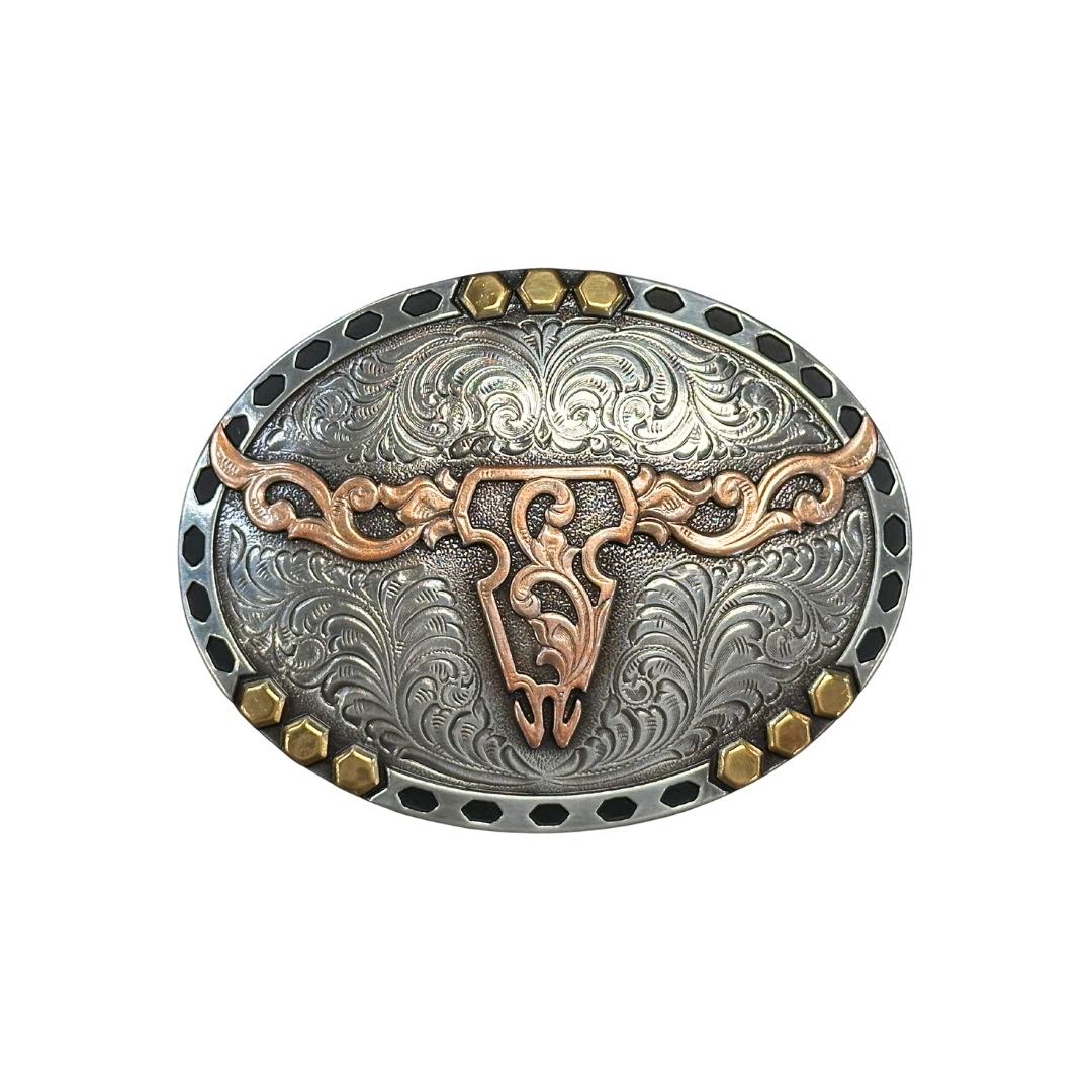 This buckle showcases a silver-tone filigree base adorned with a copper-tone longhorn figure. The edges are accented with gold-tone dots, adding a refined touch to its bold design.