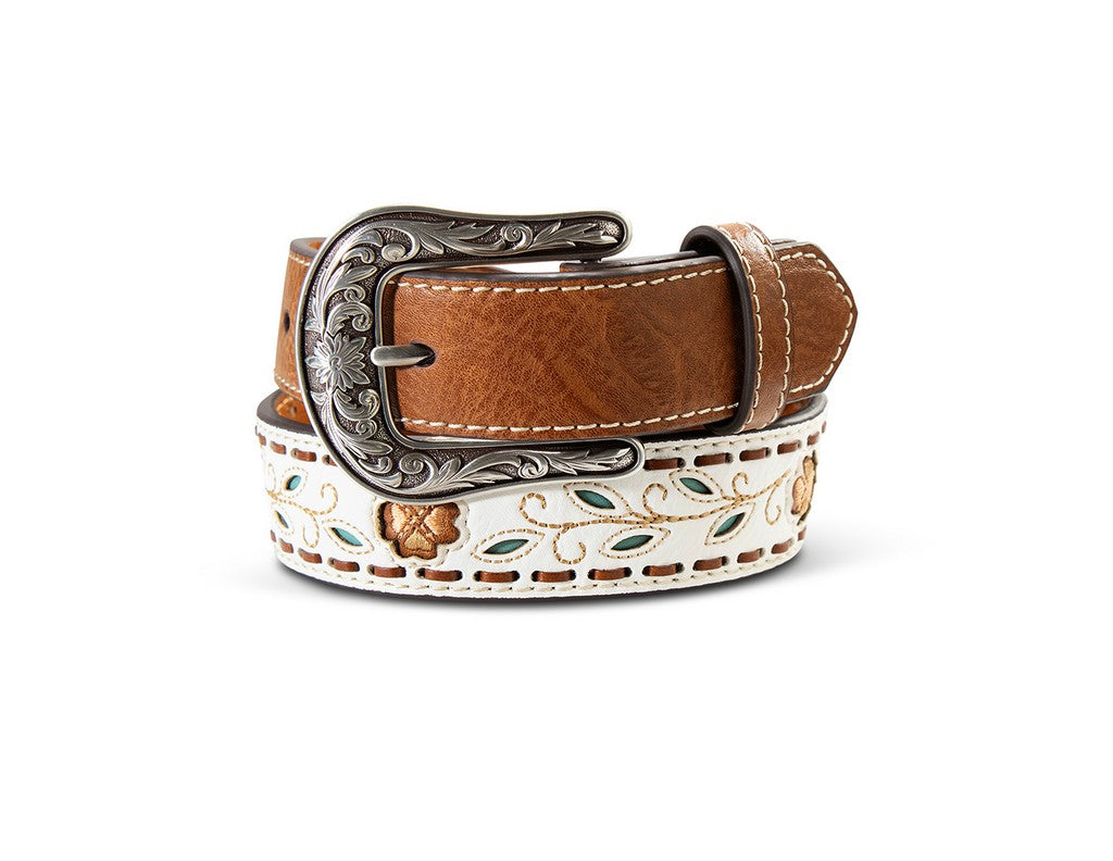 This Ariat girls belt combines Western charm with everyday versatility. Featuring an eye-catching white PU body adorned with filigree flowers and embroidered flower inlays, complemented by delicate filigree leaves with turquoise accents, it's a standout accessory for any young cowgirl. The antique silver buckle adds authentic Western flair, while the durable construction—100% PU upper with genuine leather backing—ensures lasting wear through adventures big and small. Available in sizes 20-30 with a classic 1¼" width, this belt pairs effortlessly with jeans, dresses, or Western wear for a polished look that captures true cowboy spirit.
