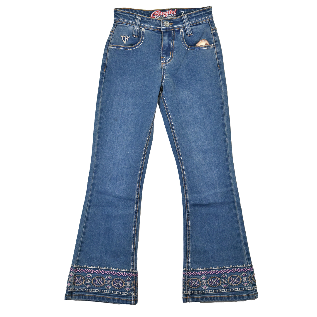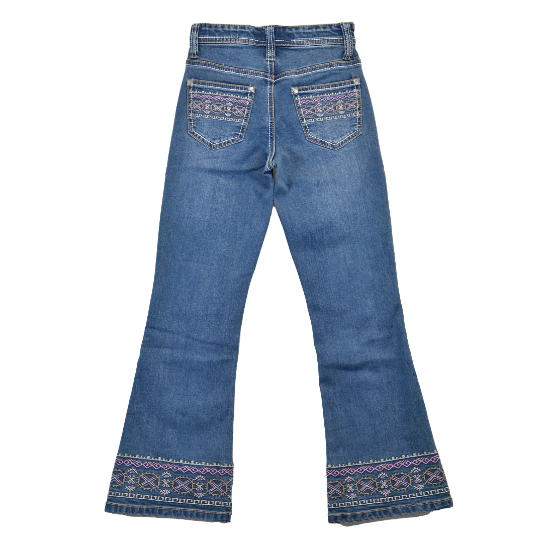 Crafted for young riders who appreciate authentic Western style, these bootcut jeans feature a versatile medium wash that pairs effortlessly with any outfit. Eye-catching aztec embroidery adorns the back pockets and hem, while contrasting white and brown stitching adds distinctive character throughout. Built for comfort and durability, they're the perfect foundation for any cowgirl's wardrobe.