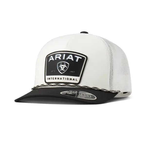 Ariat mens cap by M&F Western Products. White fabric on the front panel contrasted with a black bill and a black and white brim rope. White mesh back with a snap back closure for that perfect fit.