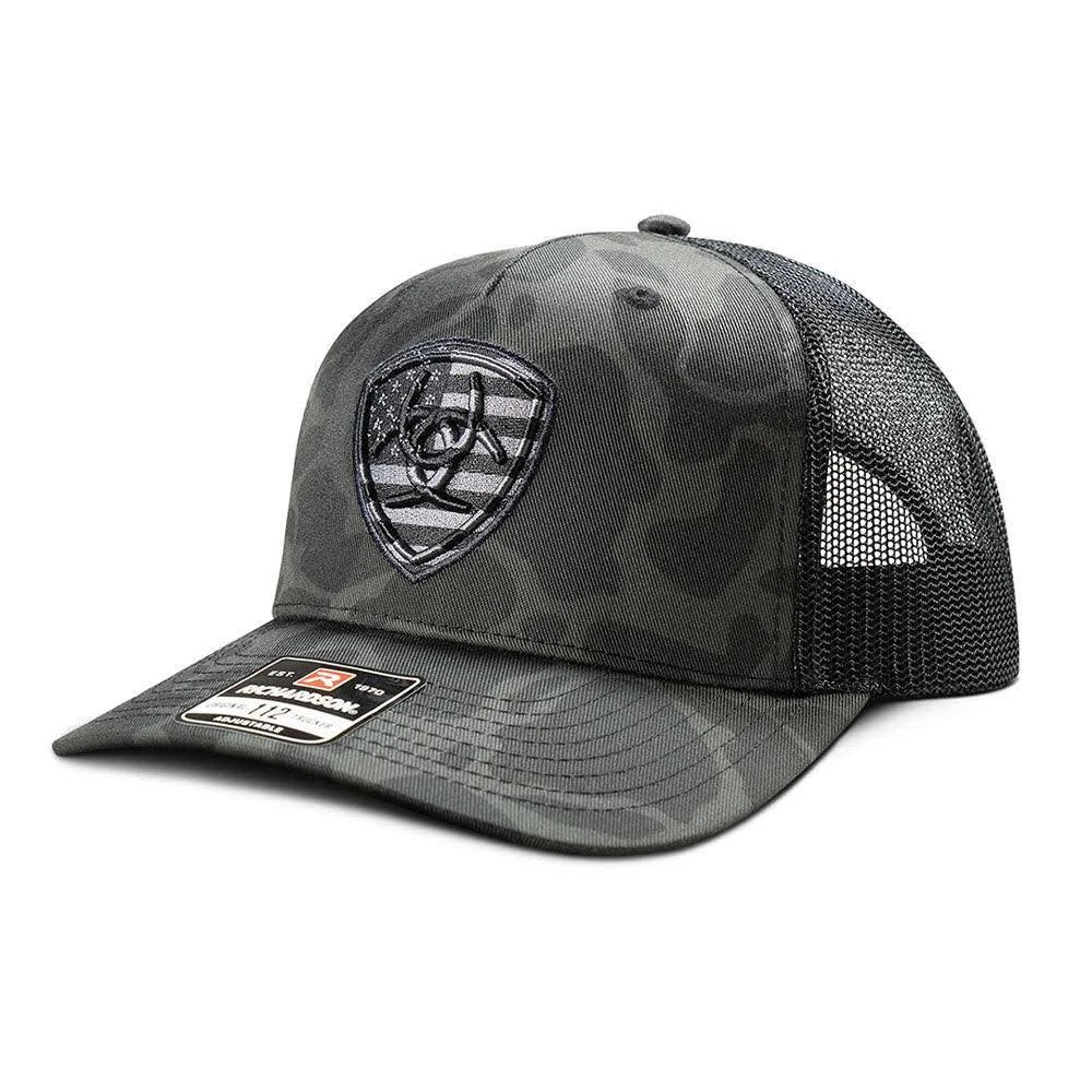 Ariat Black and grey camo front panel and bill with 3D shield embroidery and American flag printed design. Black mesh back with a snap back closure for that perfect fit.
