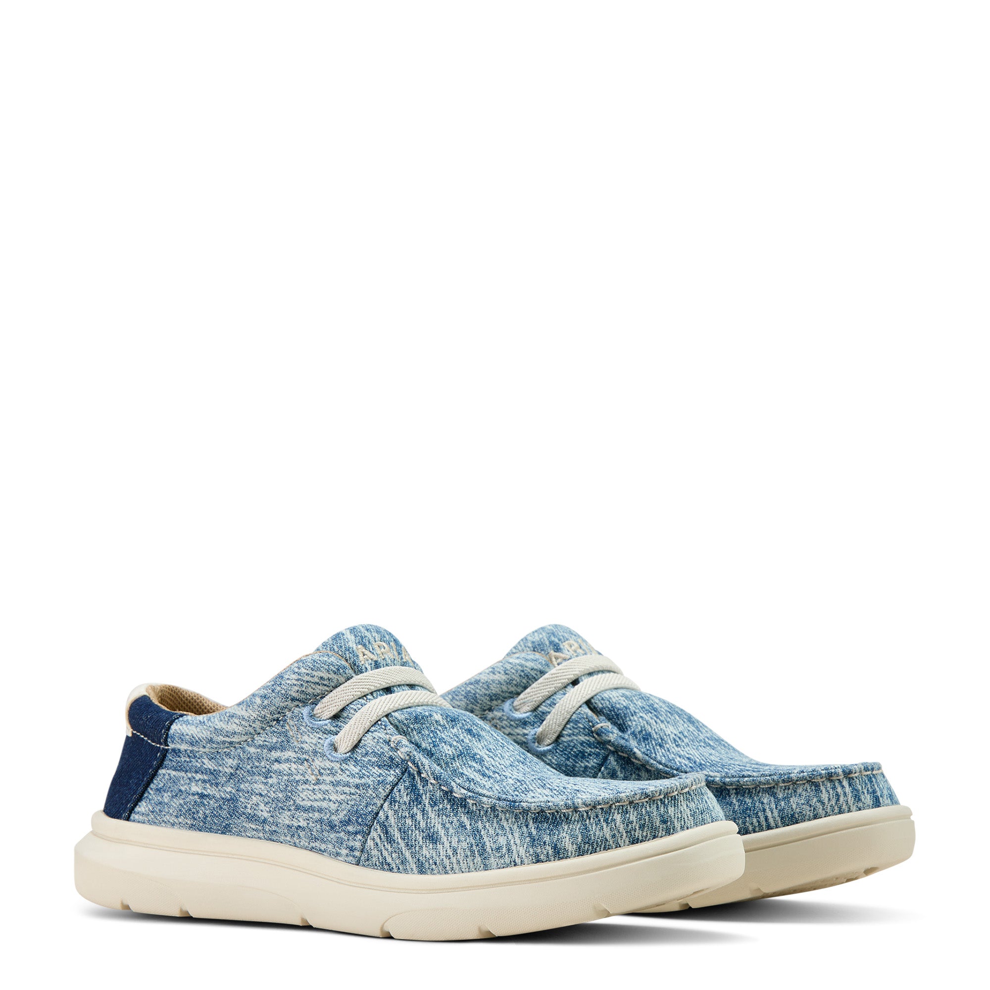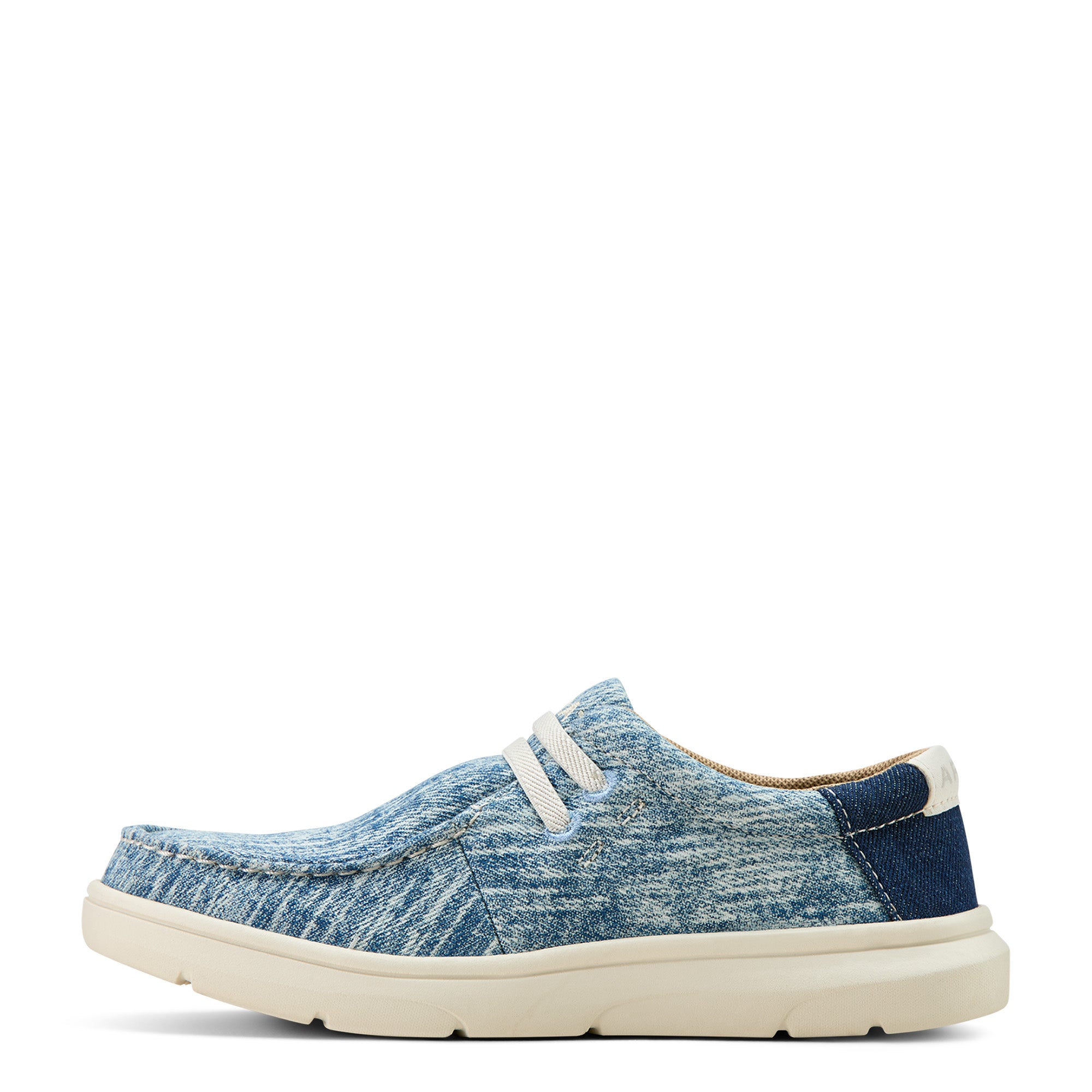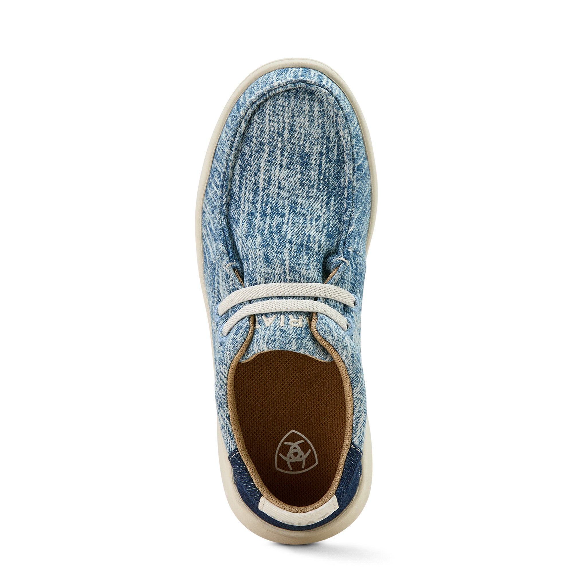 The Youth Washed Denim Hilo Shoe offers a comfortable 2.5″ flat moc toe design crafted with a durable fabric upper and breathable mesh lining. Its open cell cushioning insole and FLX Foam™ sole provide a light, springy feel that supports every step. Featuring elastic fixed laces for easy wear, this shoe combines style and comfort perfect for active youth.