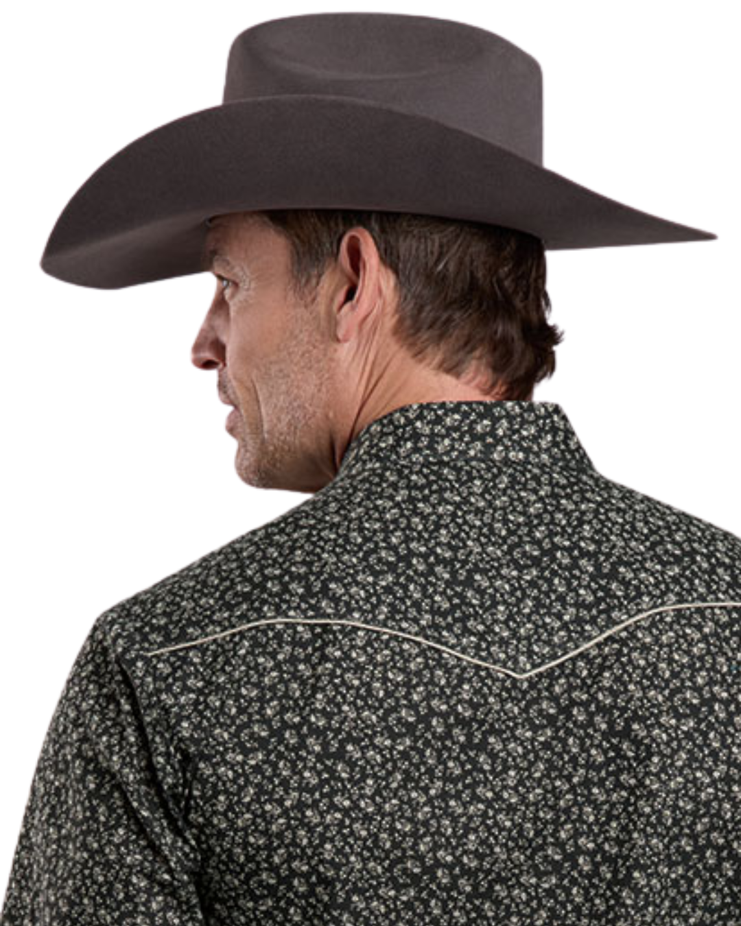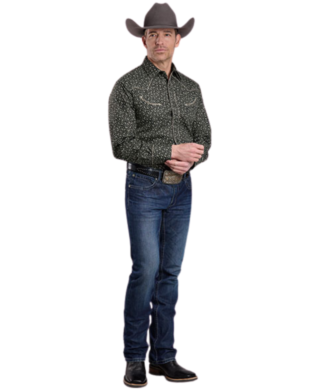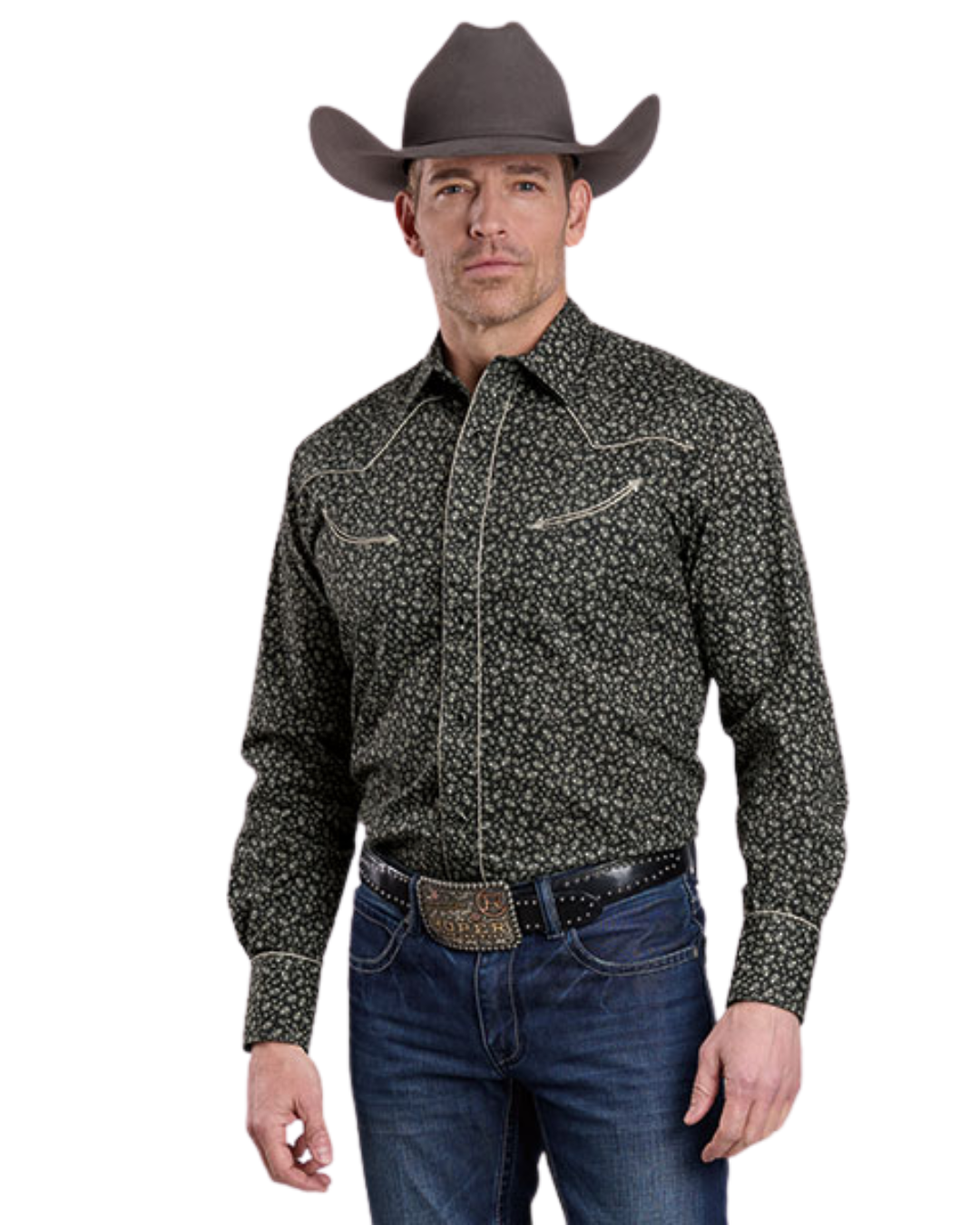 This men's long-sleeve western shirt combines classic style with distinctive details. Featuring a curved single-point back yoke and snap front closure for easy wear, it showcases a black and grey floral print on breathable cotton/poly broadcloth. Solid grey piping accents the fancy yoke and smile pockets with arrow points, while the snap cuffs offer adjustable comfort. Perfect for adding a touch of vintage charm to your wardrobe, this shirt blends rugged functionality with standout design.