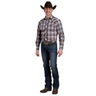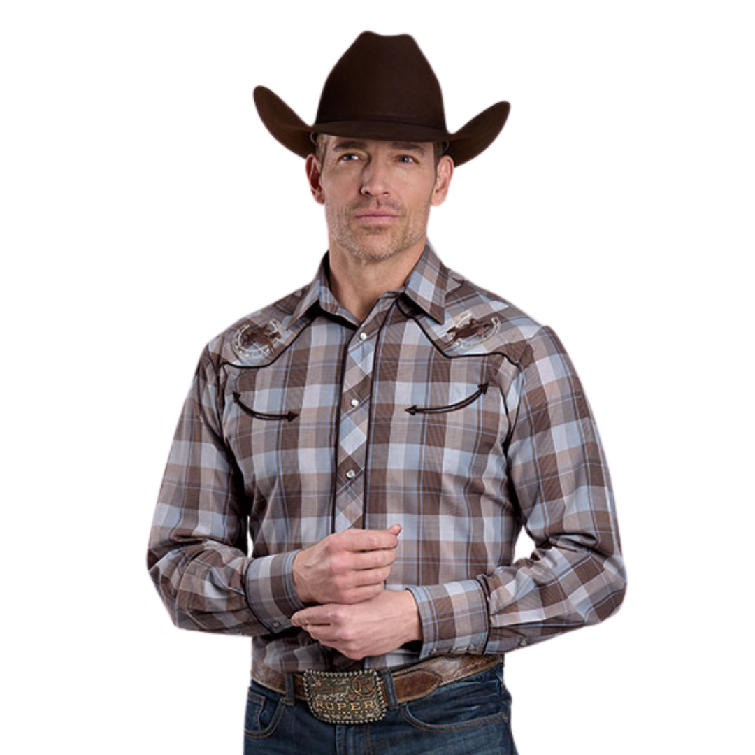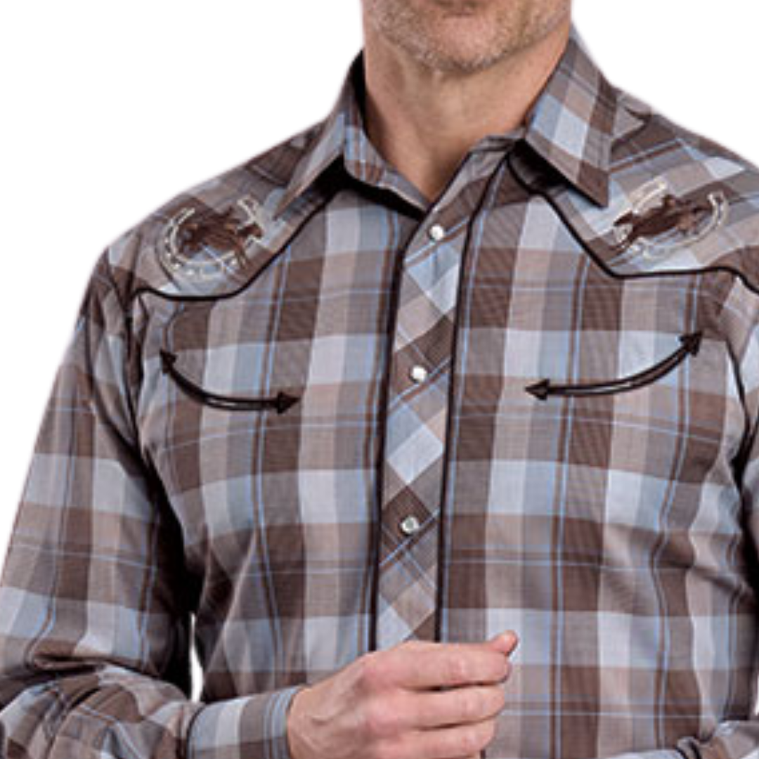 Experience classic western style with this Men's Brown Plaid Long Sleeve Shirt. Crafted from a durable cotton/poly broadcloth blend, it features a curved one-point back yoke and solid piping trim for a refined look. Smile-shaped pockets with arrow points add distinct flair, while embroidered front yokes enhance its rugged charm. Finished with a convenient three-snap cuff, this shirt combines comfort and authentic western detail for everyday wear or special occasions.