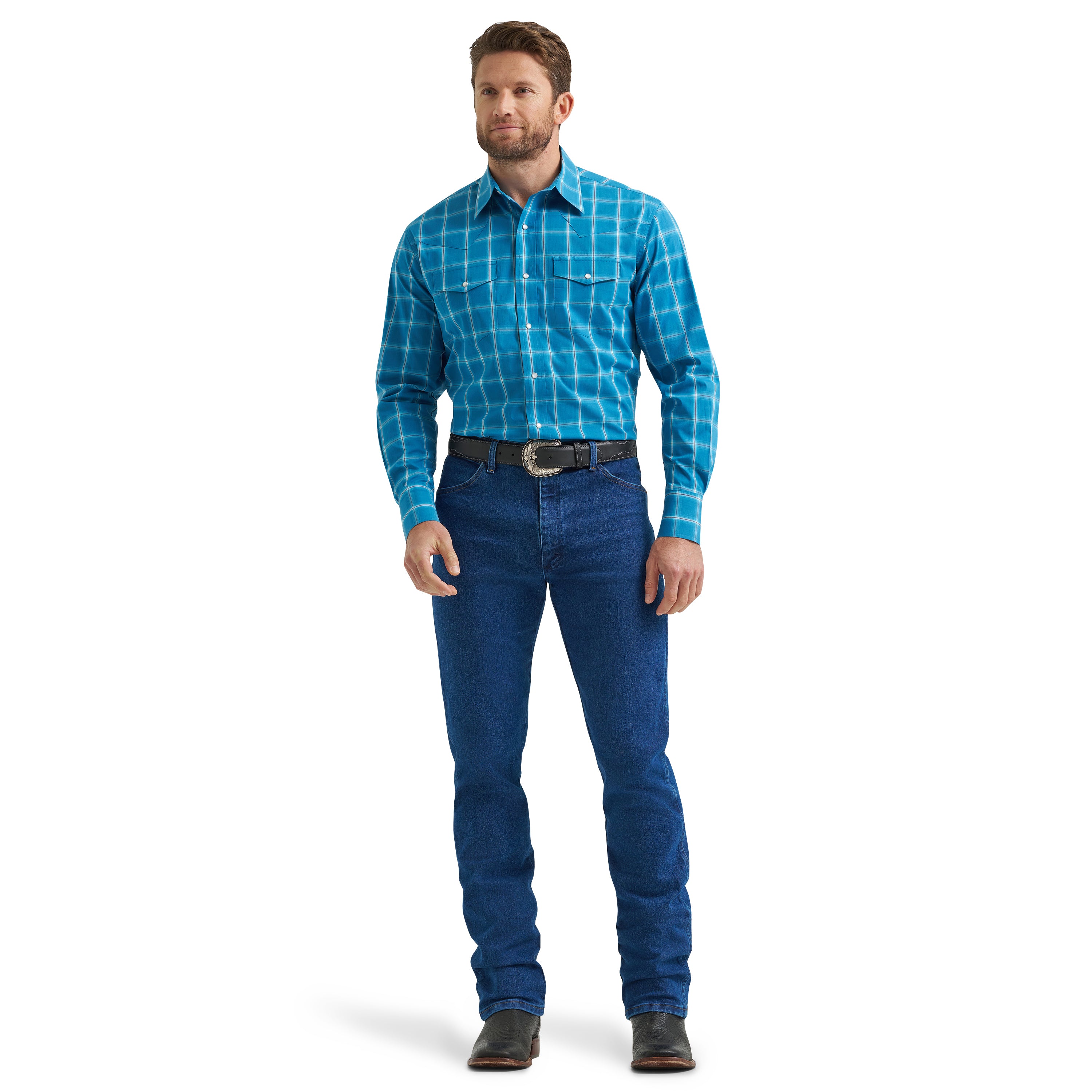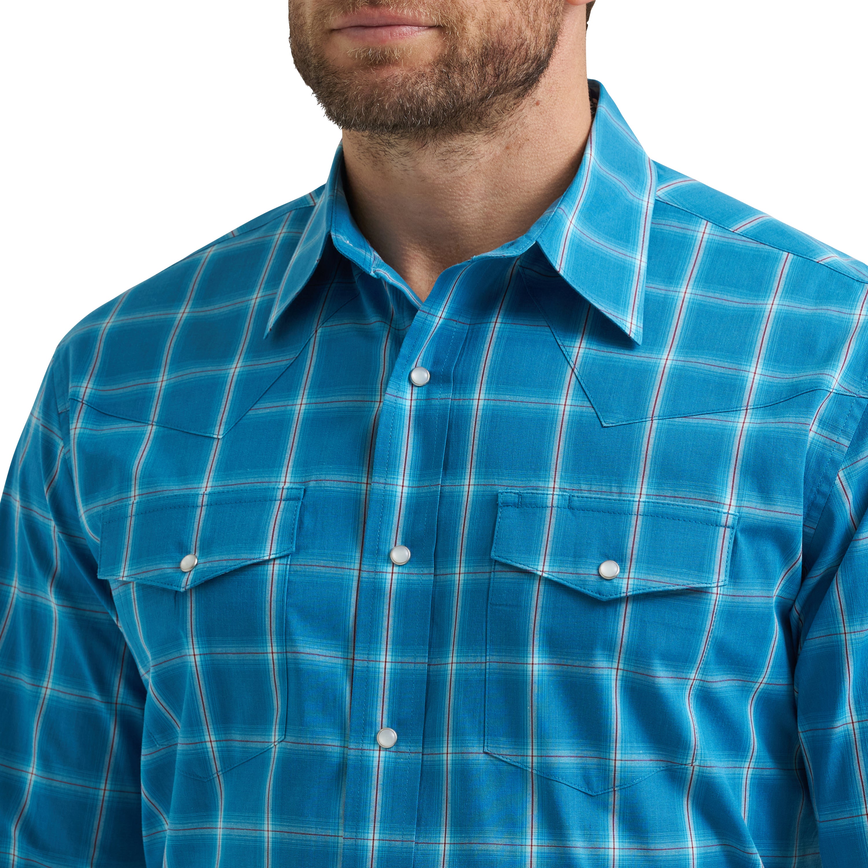 Crafted from a comfortable blend of 64% cotton, 34% polyester, and 2% spandex, this men's long sleeve shirt offers both durability and flexibility. Featuring a classic fit with authentic Western yokes and a spread collar, it combines style with tradition. Practical details include flap pockets with snap closures and a convenient pencil slot on the left pocket. The fabric's wrinkle-resistant finish, stretch capability, and stain-repellent properties ensure you look sharp and stay comfortable throughout your day.