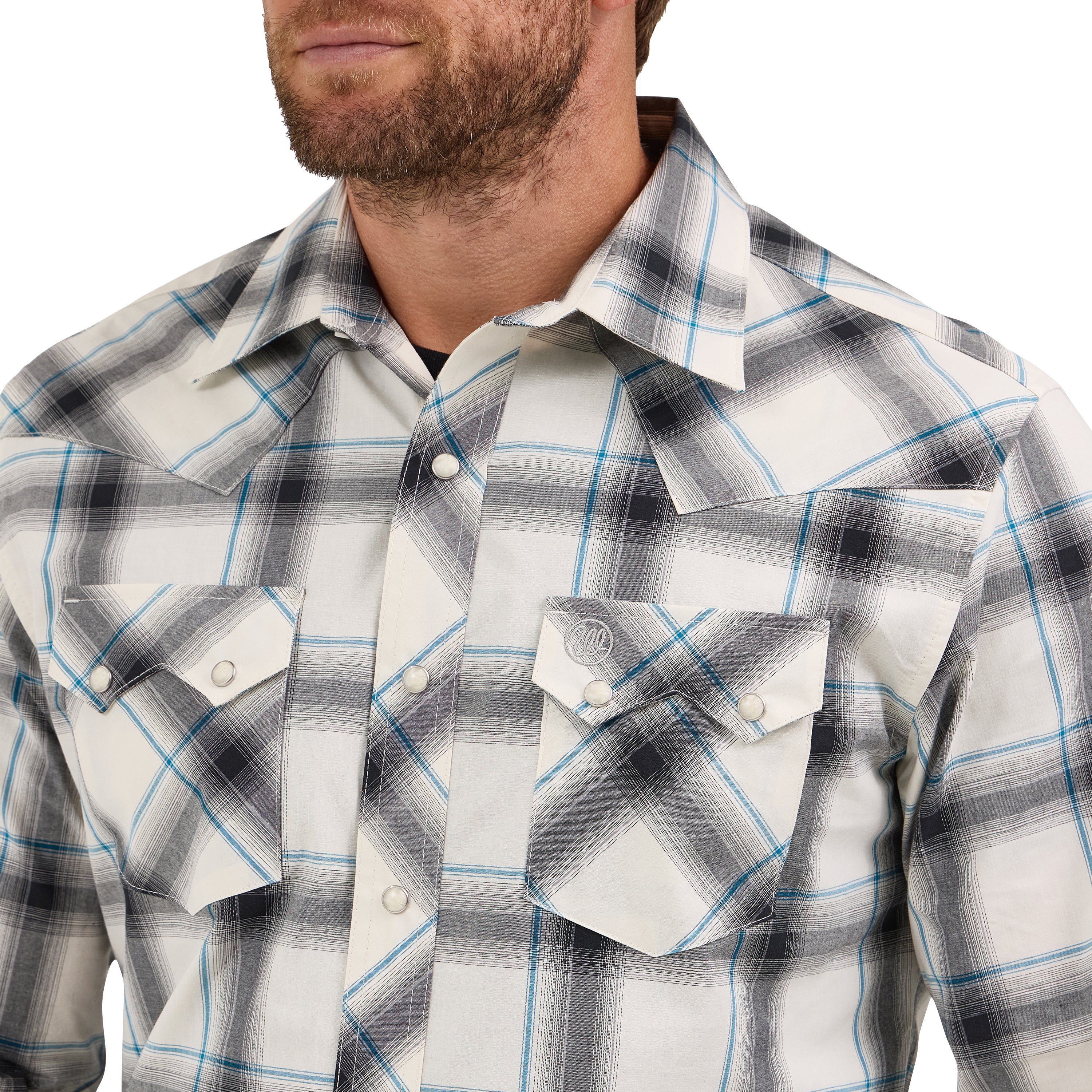 The Men's Wrangler Retro White Plaid Shirt combines classic Western style with modern comfort. Crafted from 100% cotton, it offers breathable softness and durability. Featuring authentic Western yokes, a spread collar, and two snap flap pockets, this long-sleeve shirt delivers both style and practicality. Snap cuffs add an adjustable fit, making it perfect for a polished yet rugged look any day. Embrace timeless design with a contemporary feel in this versatile wardrobe essential.