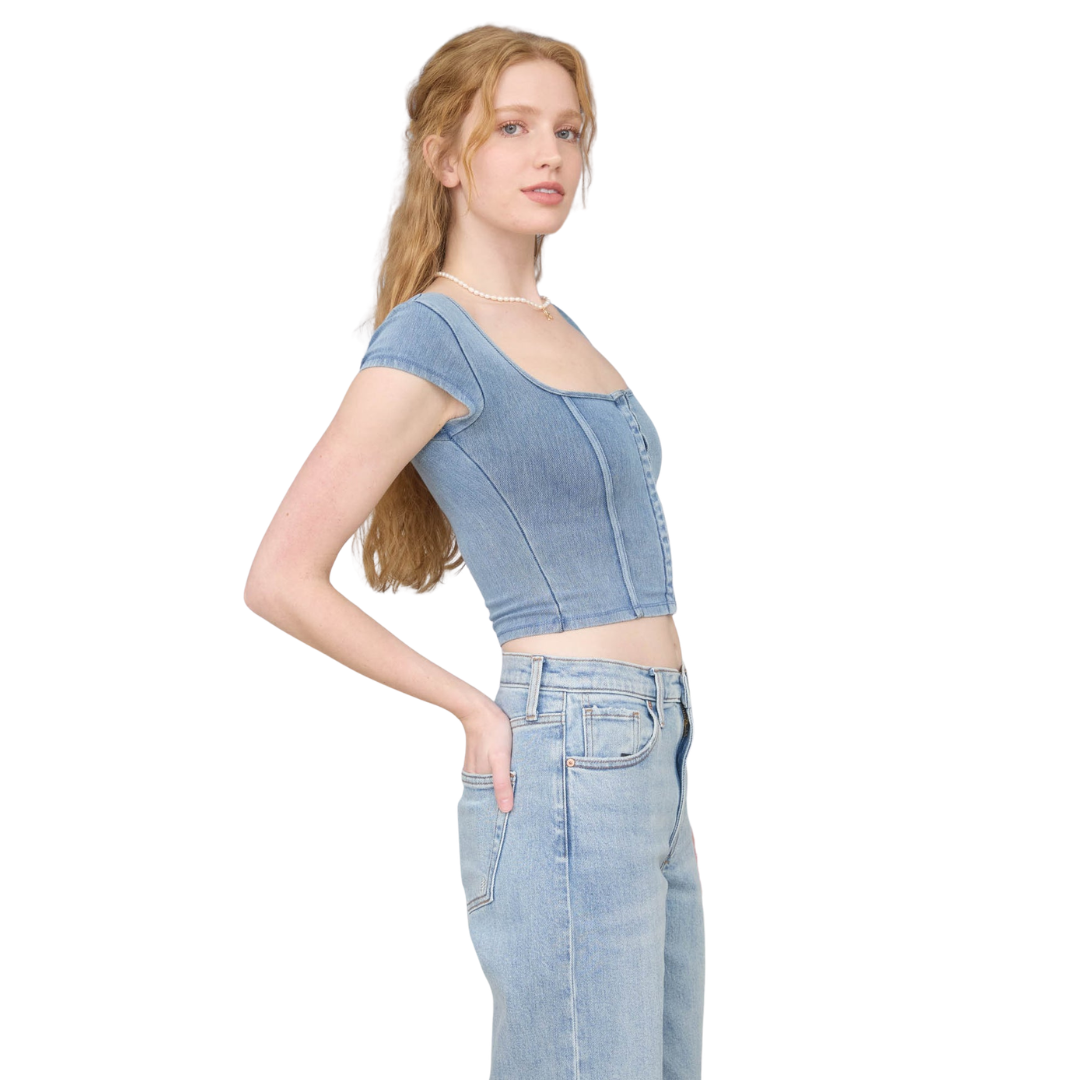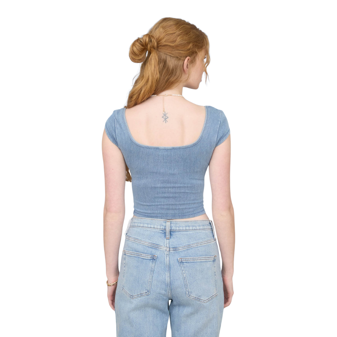 Washed Short Sleeve Front Hook Knit Crop Top in Denim