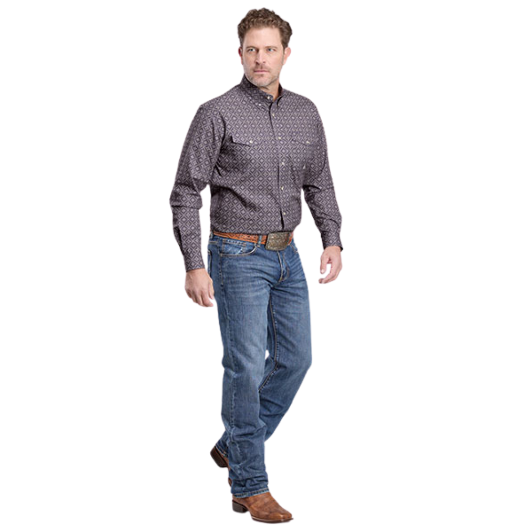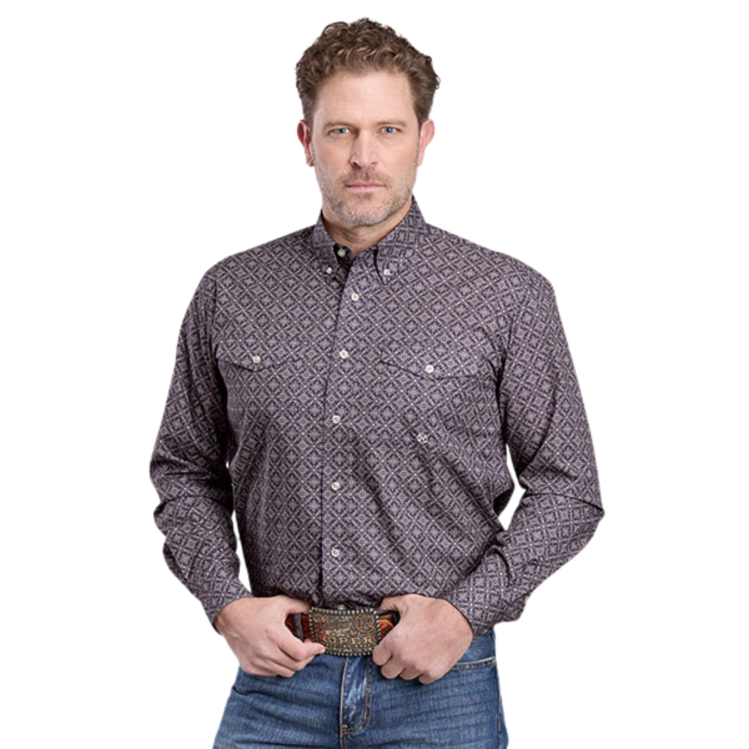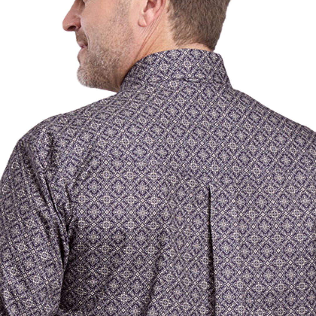 This patterned shirt features a button-down collar and a one-point back yoke with pleat and locker loop for added comfort and fit. Designed with two one-point pockets and flaps, it also showcases distinctive Roper "R" embroidery, combining style and practicality in one versatile shirt.