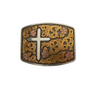 Beautifully designed buckle. The rectangle buckle has a raised engraved Cross in antique silver. Floral raised engraving in antique copper and antique brass background.