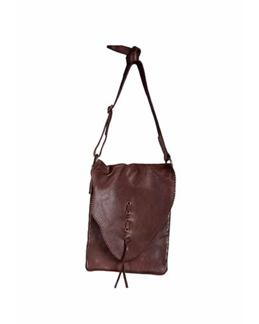 Soft leather handbag. This handbag features a natural edge flap with whip stitch trim and center groomets with leather lacing. It has a top zip closure with open pocket for cell phone and zip pocket. Exterior rear full zip pocket.