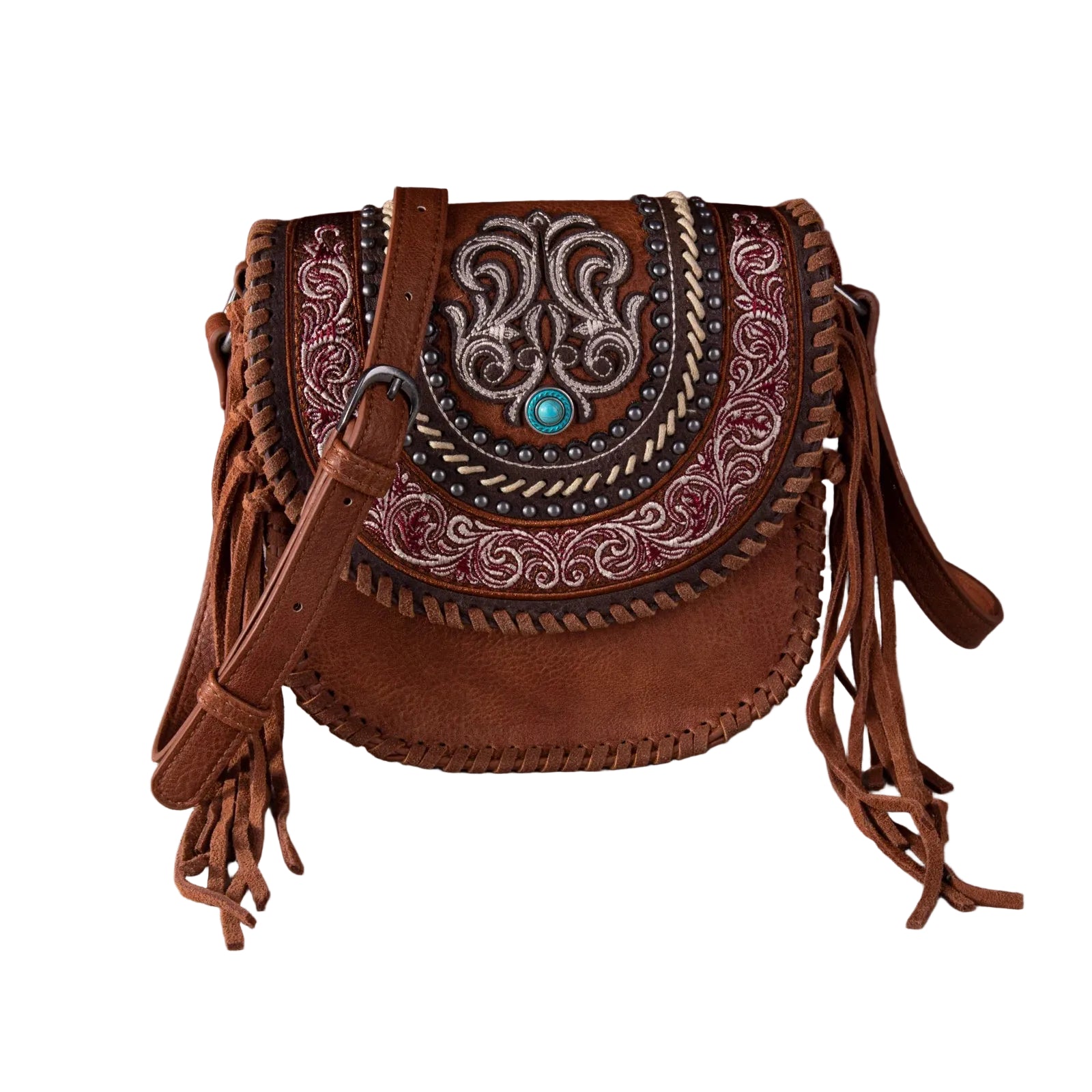 Made of PU leather, this western crossbody has: