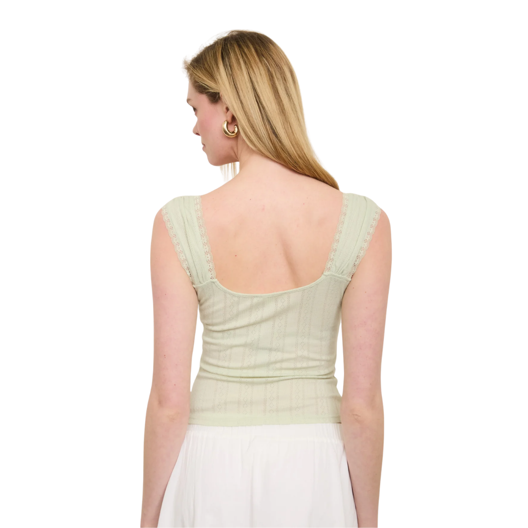 Pointelle Lace Trim Front Tie Sleeveless Knit Top in Light Sage