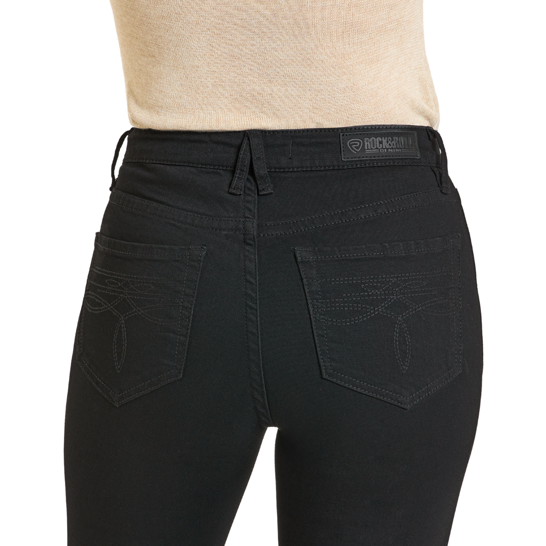 These Boot Stitch Embroidered Black High Rise Trouser Jeans offer a perfect blend of comfort and style with 92.5% cotton, 6% polyester, and 1.5% spandex. Designed by Rock & Roll Denim, they feature tummy slimming technology and a flattering front rise. Updated front and back pocket construction complements the same great leg shape, ensuring a polished look with every wear.