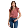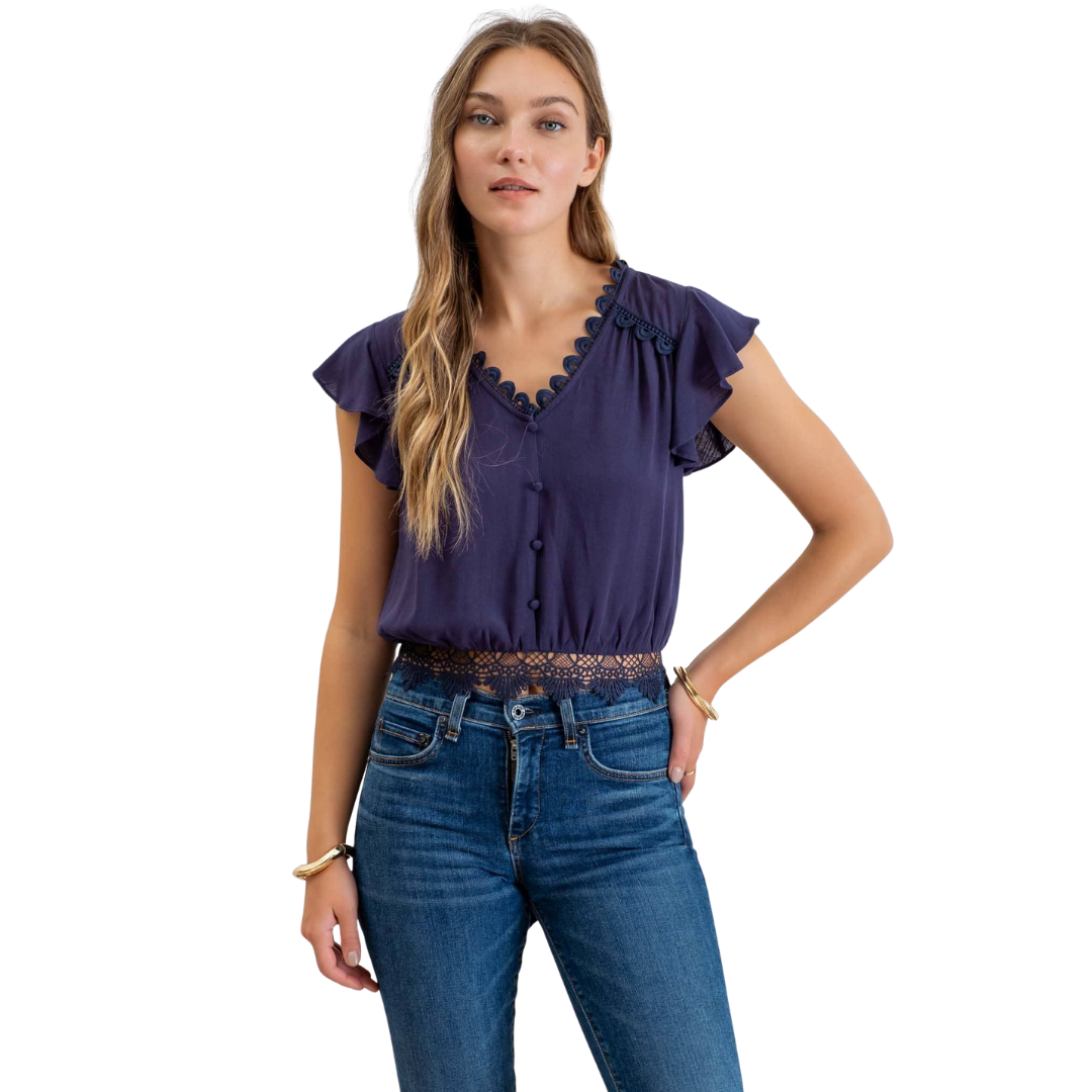 This Scallop Lace Trim Back Tie Short Sleeve Crop Top features a flattering V neckline and delicate ruffle sleeves for a feminine touch. The button-front design adds charm, while the lace trim and scalloped hem enhance its elegant style. Crafted from breathable rayon with polyester accents, it offers lightweight comfort. The back self-tie detail allows for a customizable fit, making it perfect for warm days and stylish layering. Elevate your wardrobe with this versatile woven top that combines comfort and chic design effortlessly.