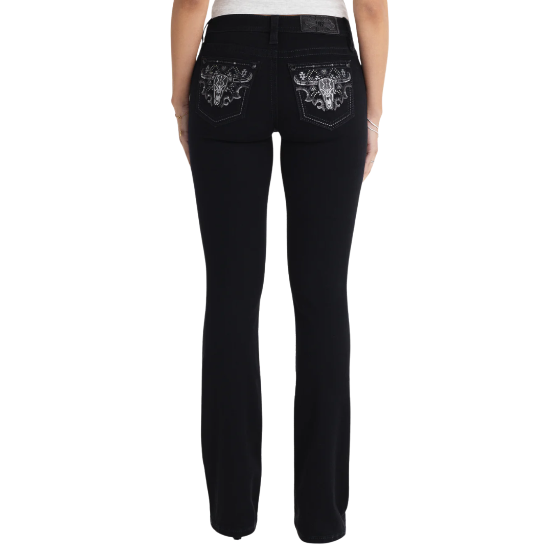 Step into standout style with the Women's Black Spur Bootcut Jeans M9553BV. These mid-rise jeans feature an embroidered leather appliqué longhorn design paired with geometric stitching and sparkling rhinestone accents for a bold, western-inspired look. Stud and rhinestone rivet details add extra flair, while the embossed black leather cross Miss Me brand patch highlights quality craftsmanship. Crafted from a comfortable blend of cotton, polyester, rayon, and elastane, these jeans offer a perfect fit with stretch. Functional five-pocket styling combines practicality with style. Easy care ensures lasting wear with gentle machine washing and tumble drying.
