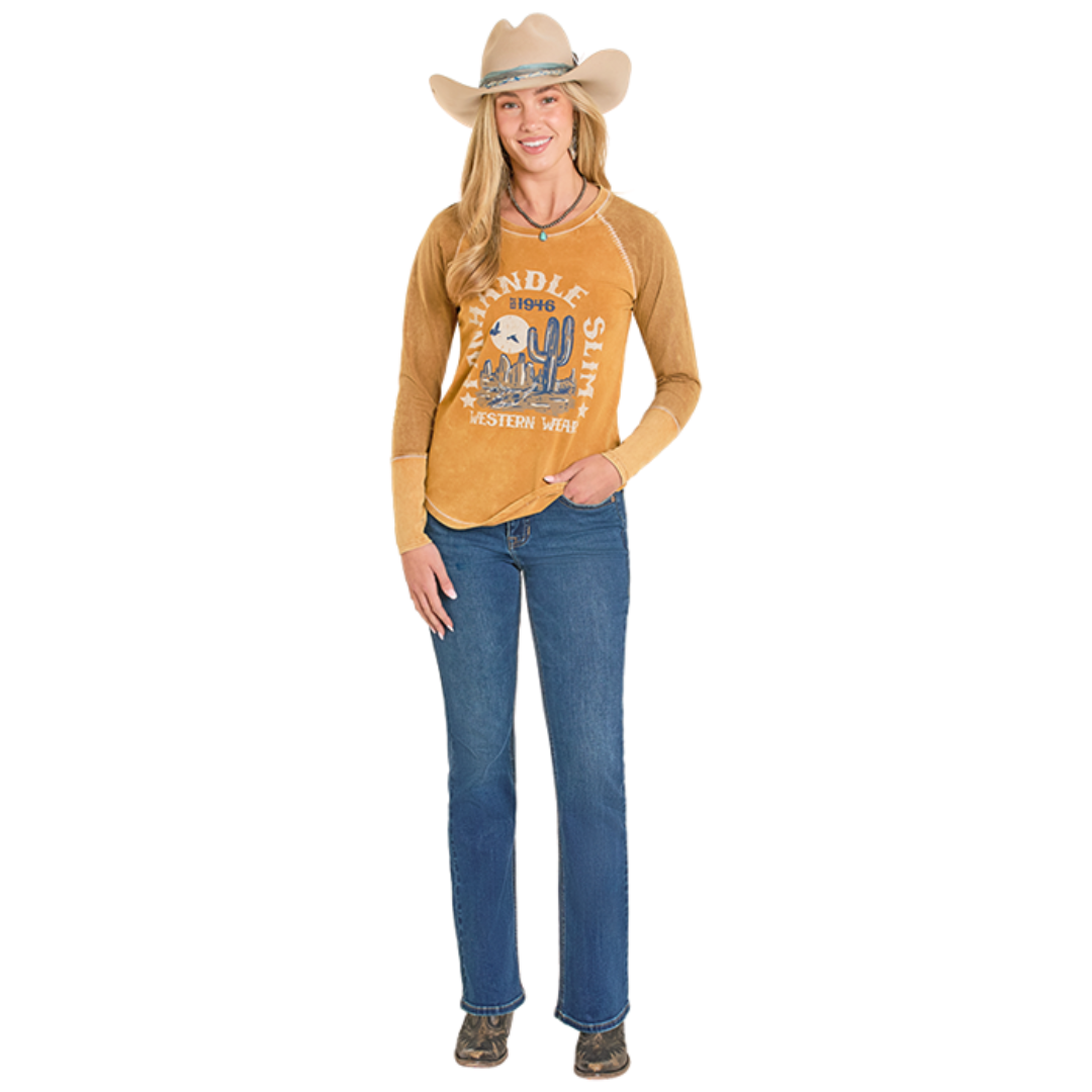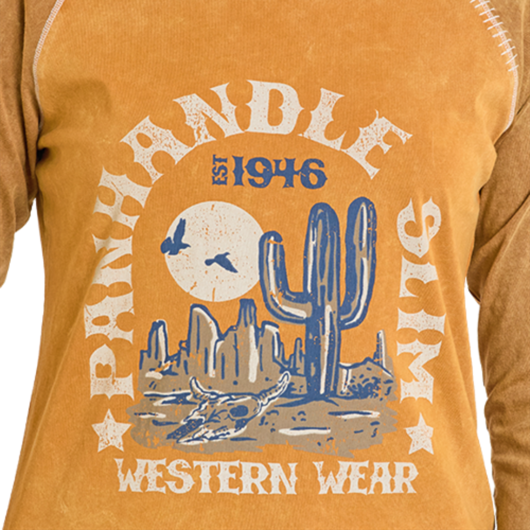 Embrace the spirit of the Southwest with this striking women's long sleeve tee featuring a bold desert cactus design. Perfect for those who appreciate authentic Western style, this versatile piece transitions seamlessly from casual outings to laid-back gatherings. The comfortable fit and quality construction make it an essential addition to any wardrobe that celebrates rugged, timeless appeal. Whether you're a true cowgirl at heart or simply drawn to distinctive Southwestern aesthetics, this tee delivers style that stands out.