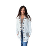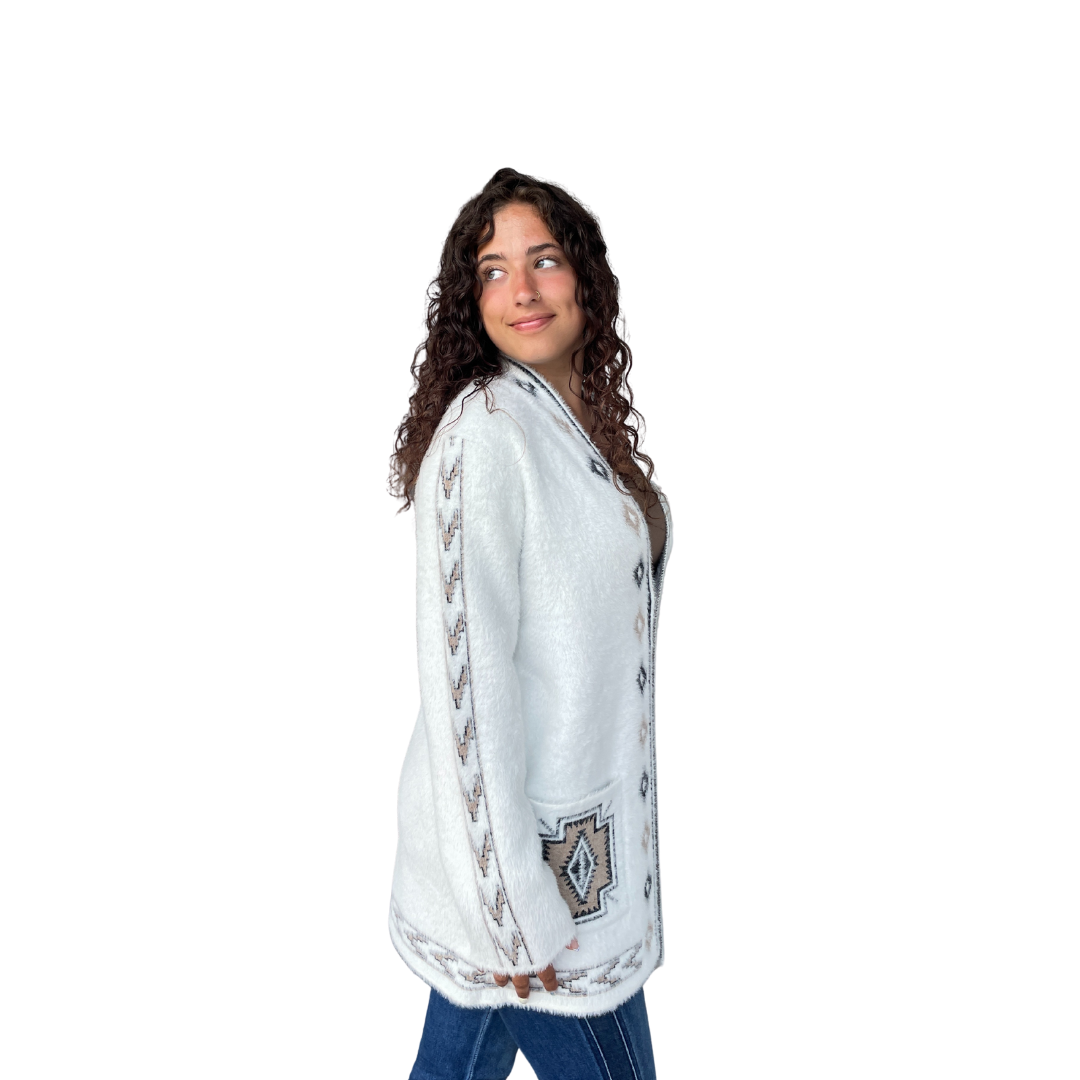 Gorgeous off white and tan with accents of grey cardigan that features a beautiful Aztec pattern. This snuggly piece will be the highlight of your fall and winter activities.Â