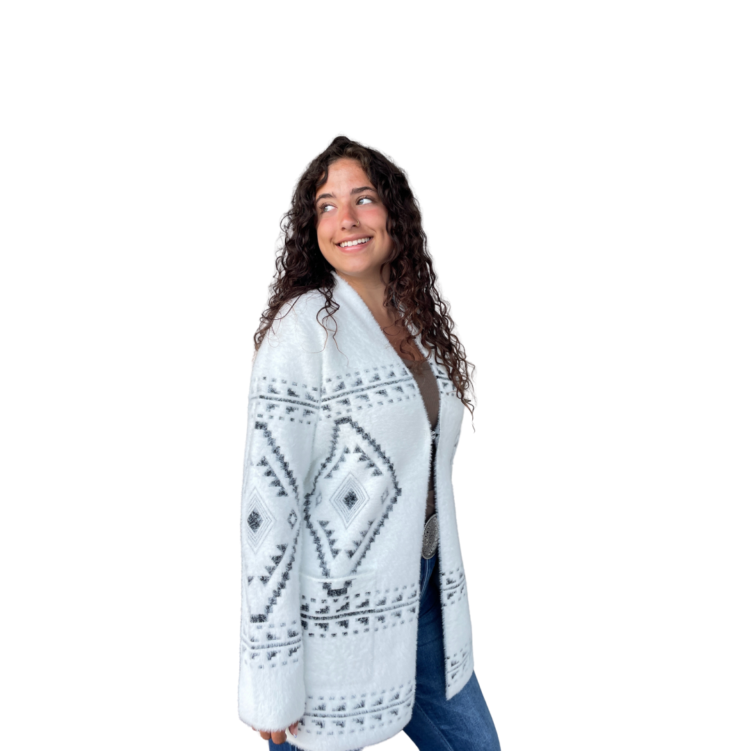 Gorgeous off white and tan with accents of grey cardigan that features a beautiful Aztec pattern.  This snuggly piece will be the highlight of your fall and winter activities.