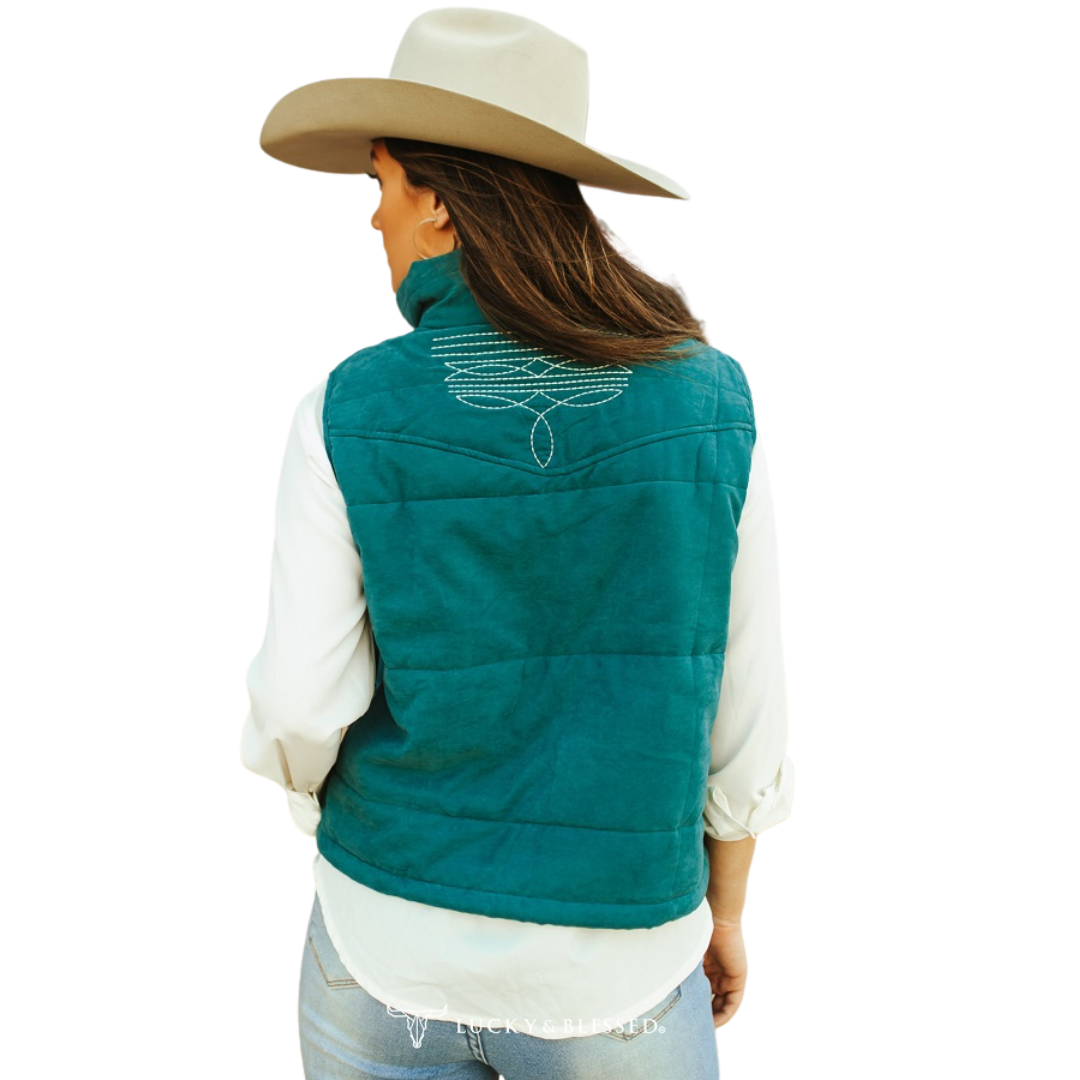 Lucky And Blessed Women's Teal Puffer Vest - Aztec Lined Boot Stitch Quilted Vest JO235