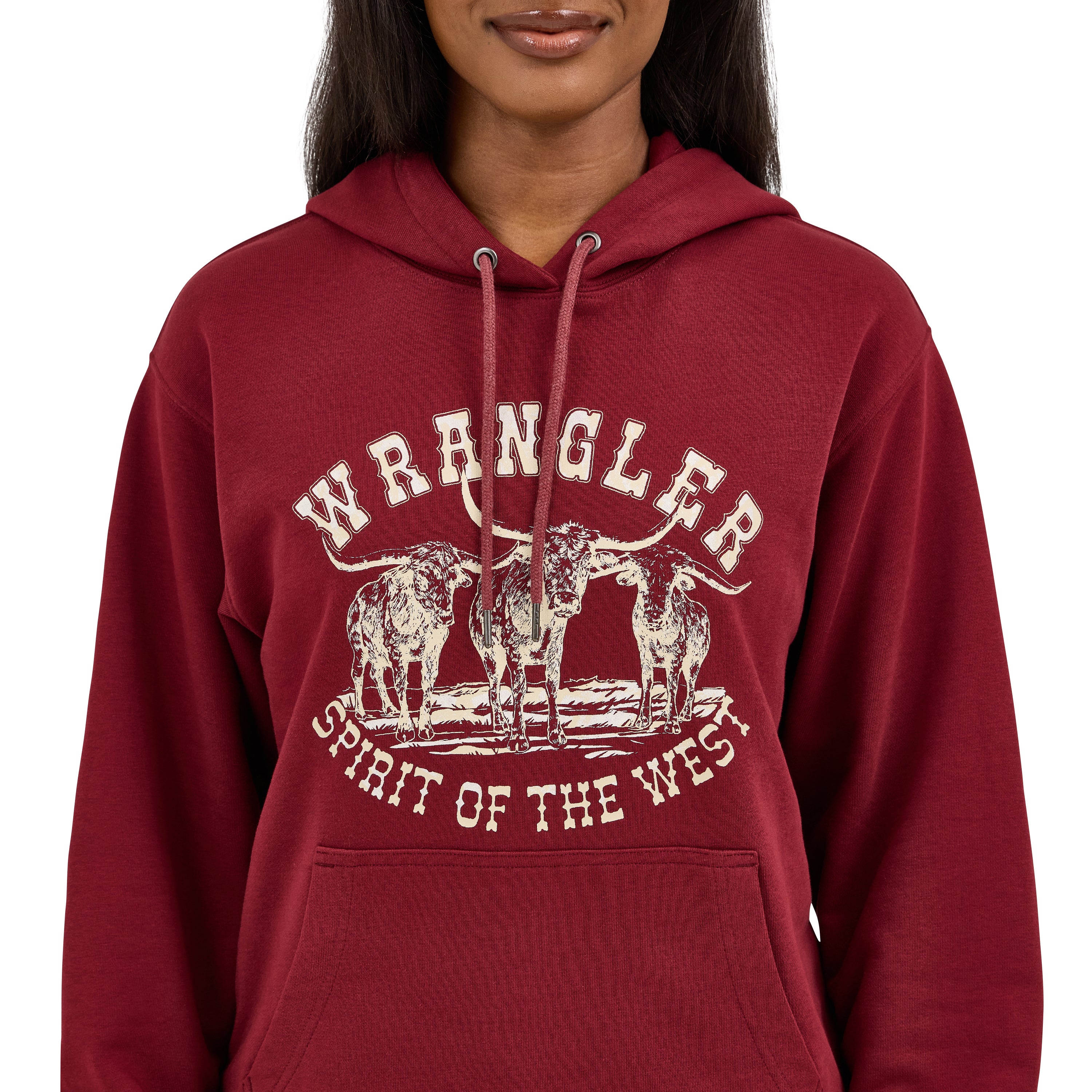 Embrace classic western style with the Women's Wrangler Retro Hoodie in Cabernet. Crafted from a comfortable 80% cotton and 20% polyester blend, this regular-fit hoodie features a striking white Longhorn Spirit of the West graphic for a bold statement. The kangaroo pocket adds practical warmth and convenience, making it perfect for everyday wear or layering during cooler days. Experience lasting comfort and authentic style with this versatile wardrobe essential.