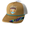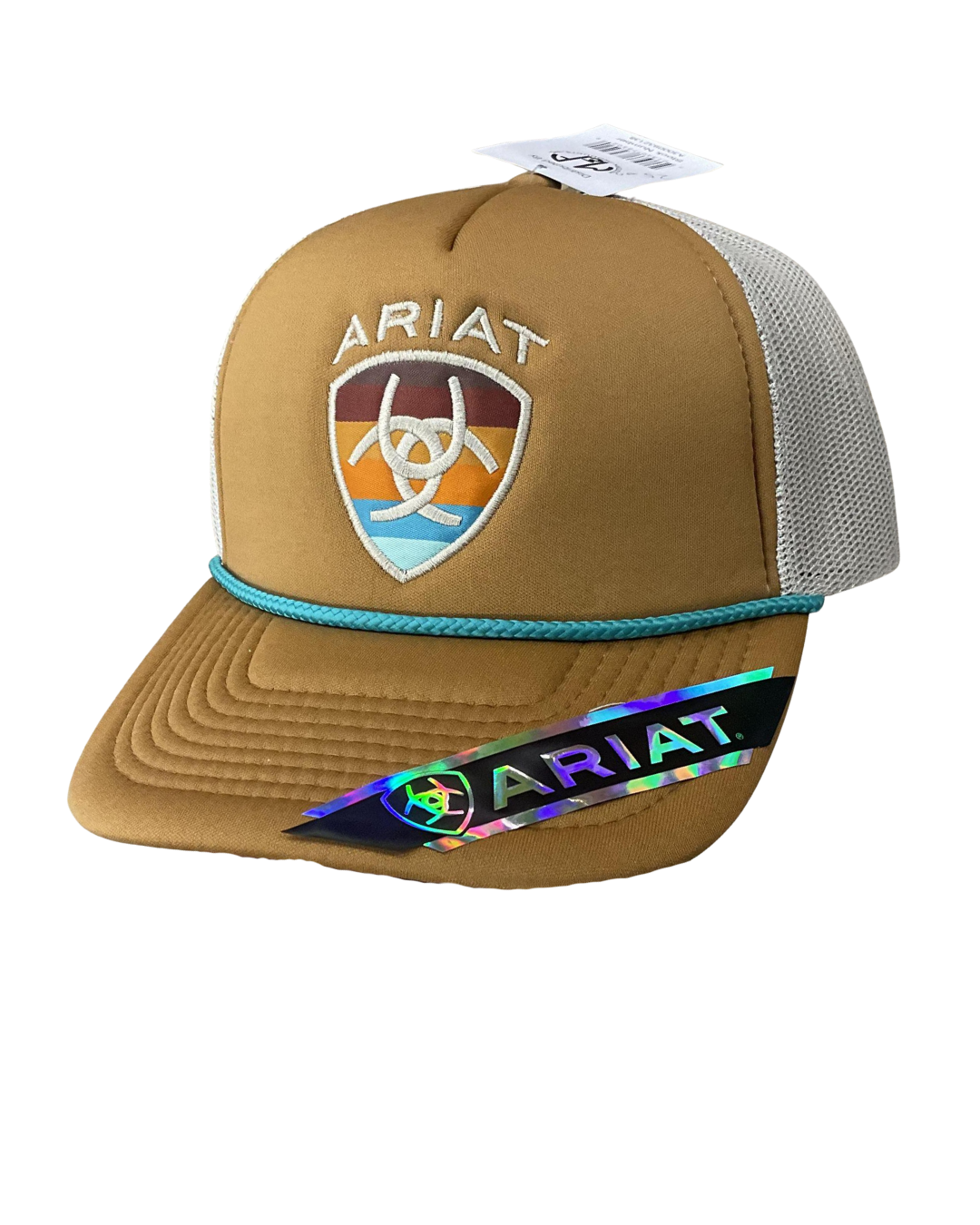 Burnished gold foam front and bill with a turquoise brim rope. Embroidered Ariat name above the striped patch. Khaki mesh back with snap back closure for that perfect fit.