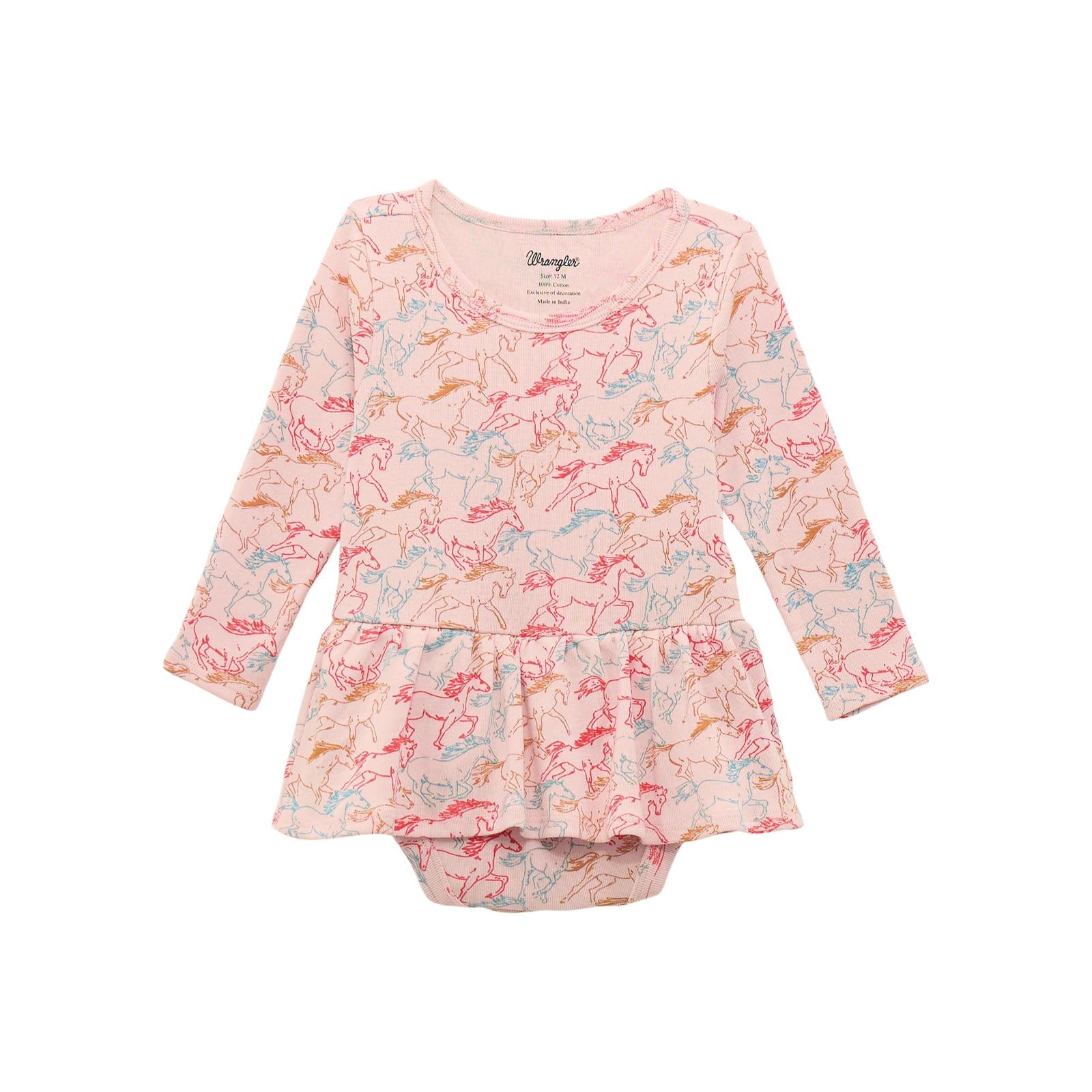 This adorable baby girl bodysuit features a charming pink horse print pattern and is crafted from 100% soft cotton. The knit design includes an attached skirt, offering both comfort and style for your little one. Perfect for everyday wear, it combines practicality with a cute, playful look.