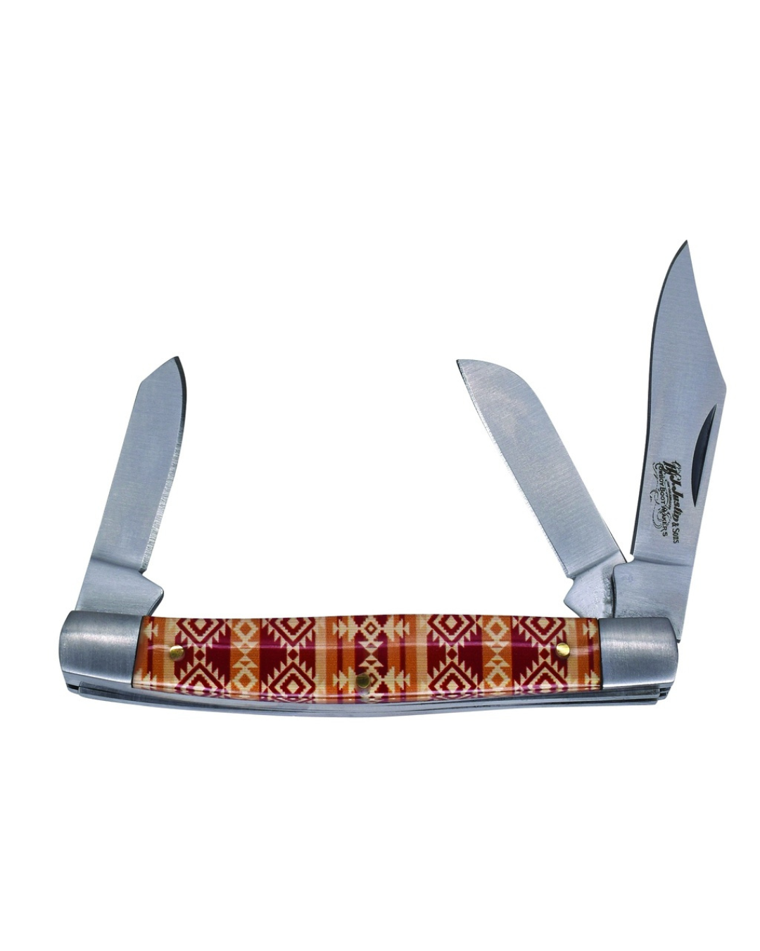 This three-blade stockman knife features a vibrant acrylic handle in tan and red with an Aztec-inspired pattern. Lightweight and compact, it's a great everyday carry or giftable piece. A fun and colorful take on a western classic.