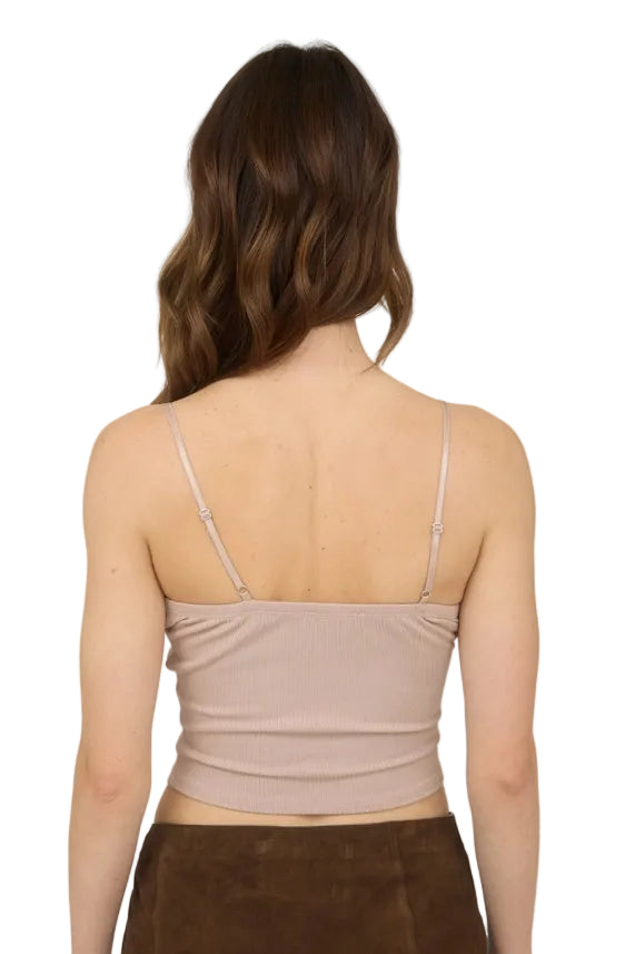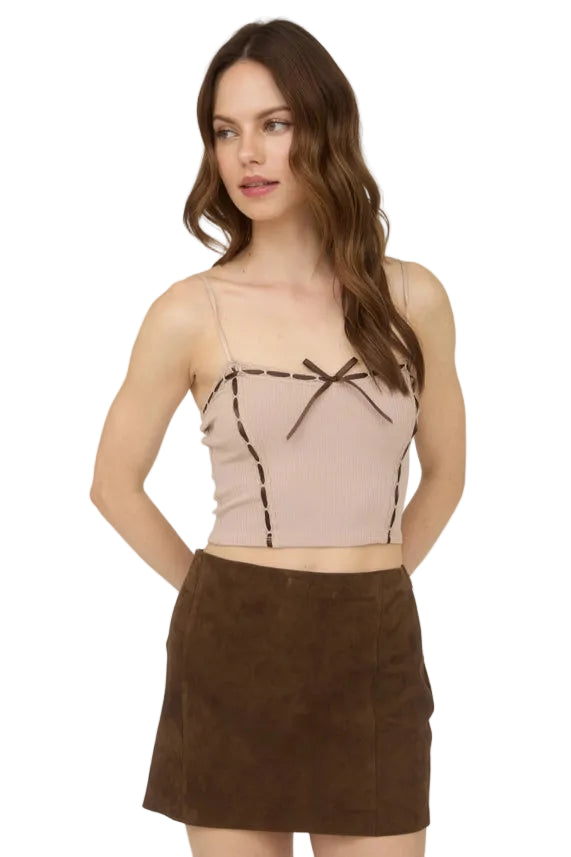 Lace Trim Front Tie Spaghetti Strap Knit Crop Top in Light Mocha