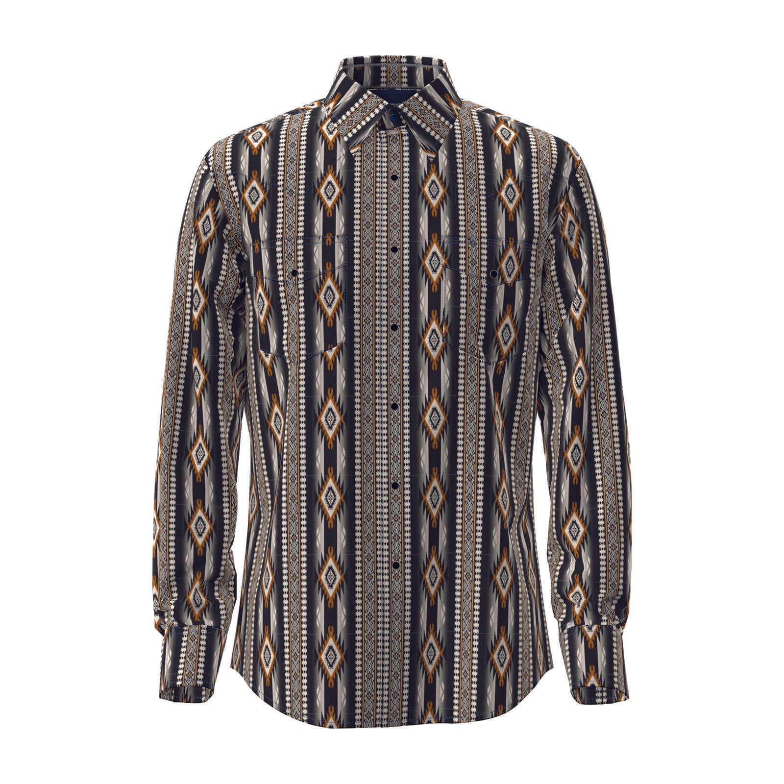 A timeless icon in western wear, this Wrangler Checotah long-sleeve shirt delivers authentic style with striking Navajo-inspired prints. The classic fit and spread collar create a polished look, while practical details like snap flap pockets, a pencil slot, and adjustable cuffs keep you organized and comfortable throughout your day. Constructed from pure cotton, it breathes naturally whether you're working the range or heading into town. The full-length snap front makes dressing effortless, and the pointed yokes add that unmistakable western edge. Pair it with your favorite Wrangler jeans for a complete, head-turning outfit that commands respect.