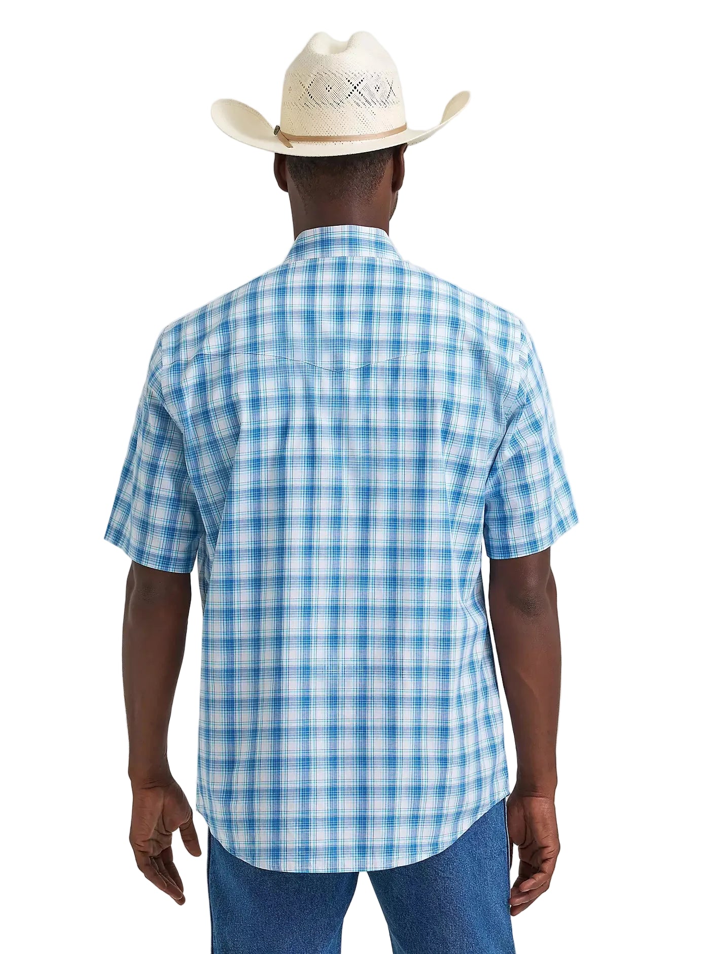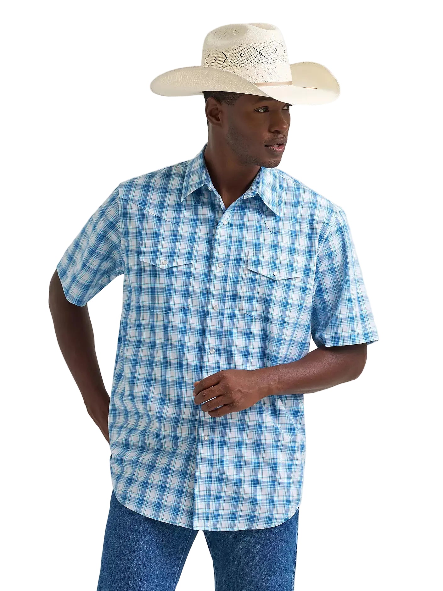 Experience authentic western style with this seaside blue plaid shirt designed for the modern cowboy. The intelligent fabric blend—64% cotton for breathability, 34% recycled polyester for strength, and 2% spandex for flexibility—ensures all-day comfort whether you're in the saddle or at the saloon. Wrinkle-resistant technology means less time ironing and more time doing what matters. Genuine snap closures deliver that unmistakable western aesthetic while offering practical durability. This short-sleeve essential resists fading and maintains its shape through countless washes, making it a reliable foundation for any cowboy's closet.