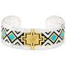 Not even gravity can keep you down with the rise above Cuff Bracelet. This bracelet features a mesmerizing geometric pattern as the design. Gold tones with black and turquoise paint create a diamond pattern along the piece. Stunning silver engravings adorn the top and bottom of the design. This cuff bracelet is a standout piece and will easily complement any outfit. Pair it with another bracelet, or rock it alone for a look that makes a statement. One size fits most.