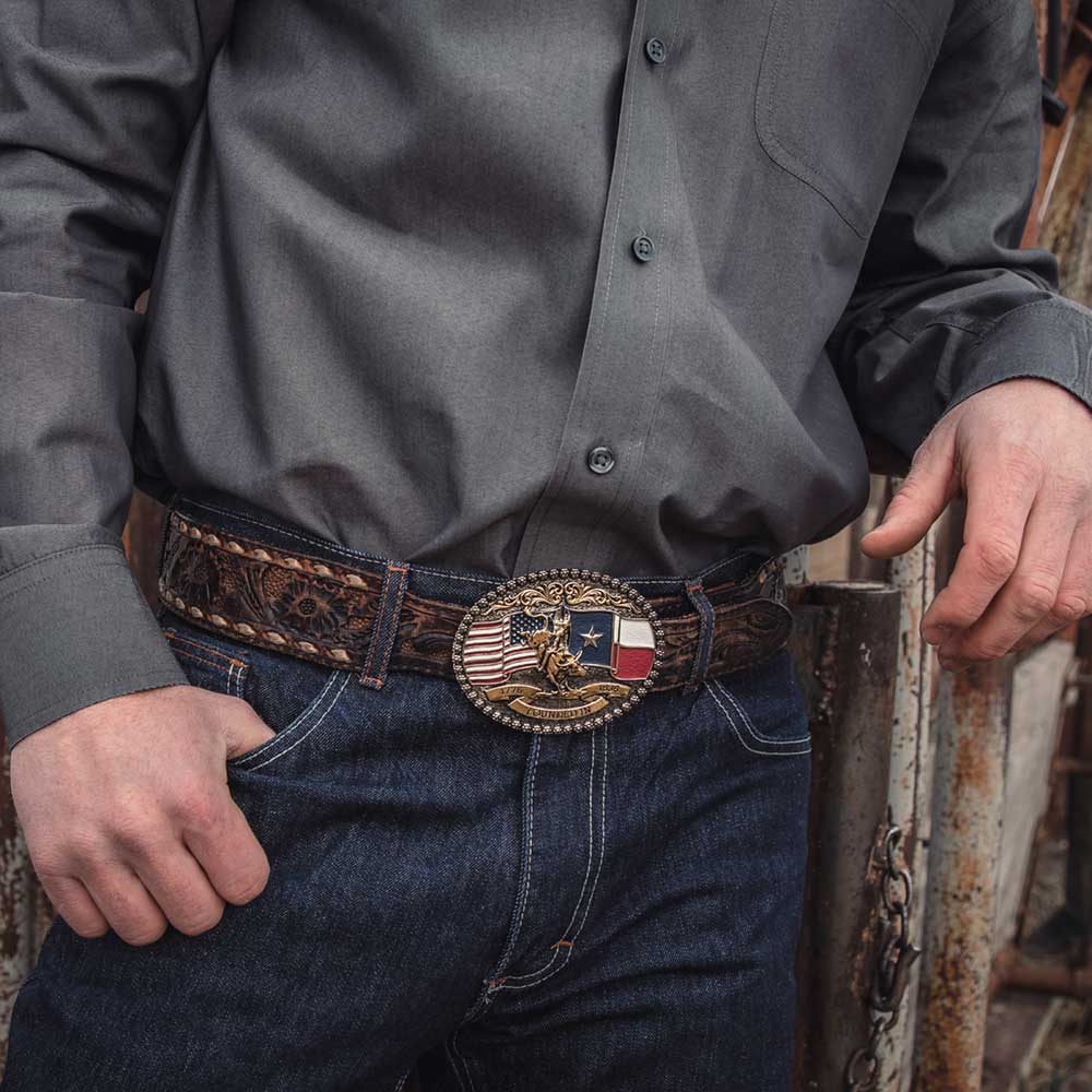 Silver-toned and oval in shape, our Texas 1836 Attitude Belt Buckle is classic longhorn country! It features studded trim, a roughed texture background, a gold-tone bull-riding figure in the center, along with the words "Founded in 1776 + 1836." Western filigree, the American flag, and the Texas state flag add to its charm. Standard 1.5 inch belt swivel.