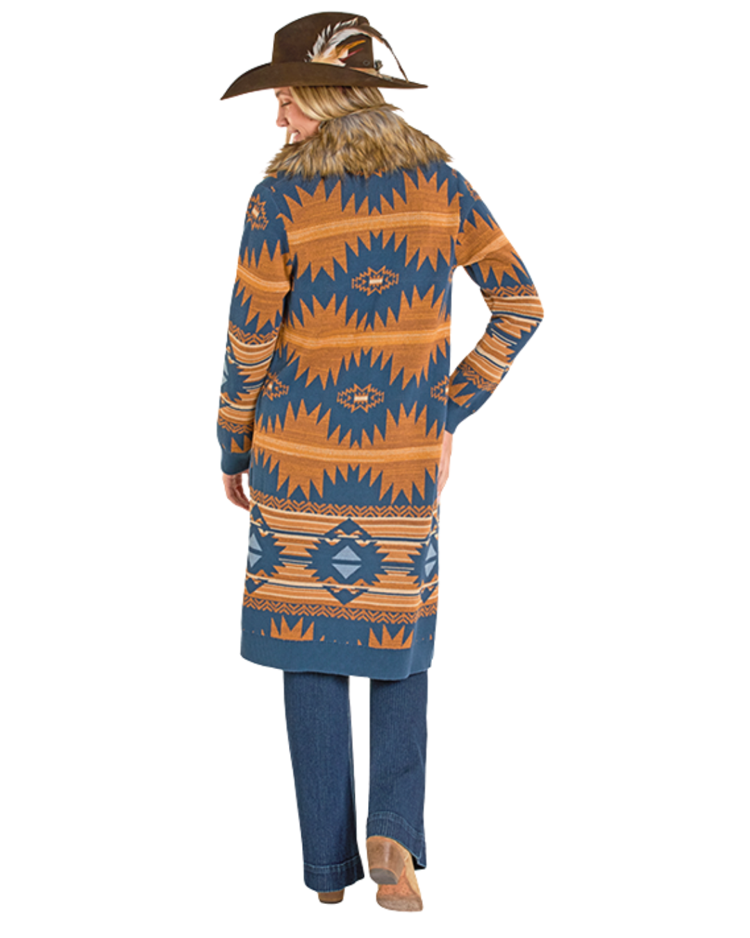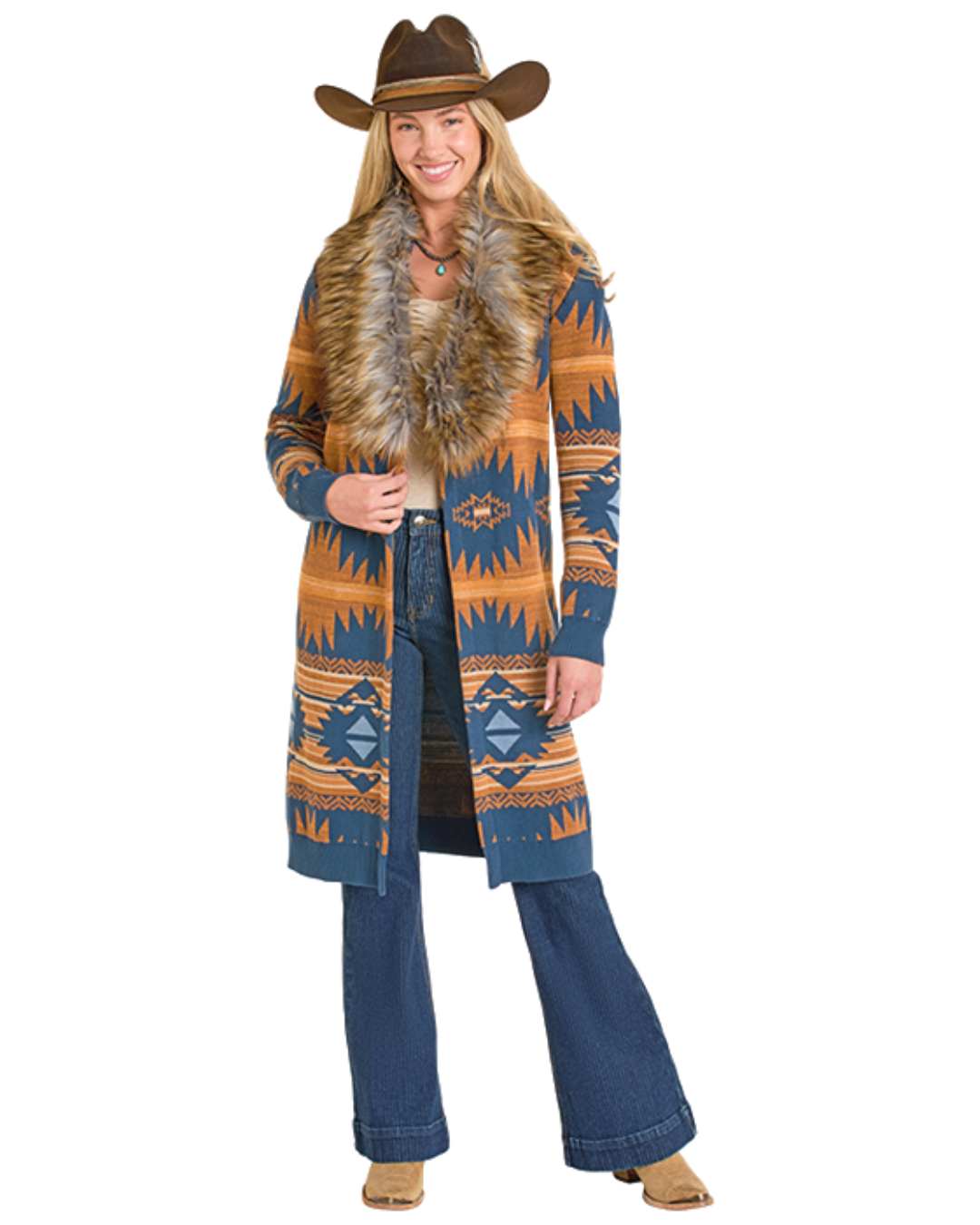 Wrap yourself in Southwestern style with this stunning navy Aztec sweater faux fur cardigan. Featuring bold geometric patterns inspired by traditional tribal designs, this piece layers beautifully over your favorite outfits while the plush faux fur trim adds luxurious warmth and texture. Perfect for cooler evenings on the ranch or casual weekend wear, the rich navy base pairs effortlessly with denim, boots, and classic Western pieces. Cozy, versatile, and undeniably eye-catching—this cardigan is the statement piece your wardrobe has been waiting for.