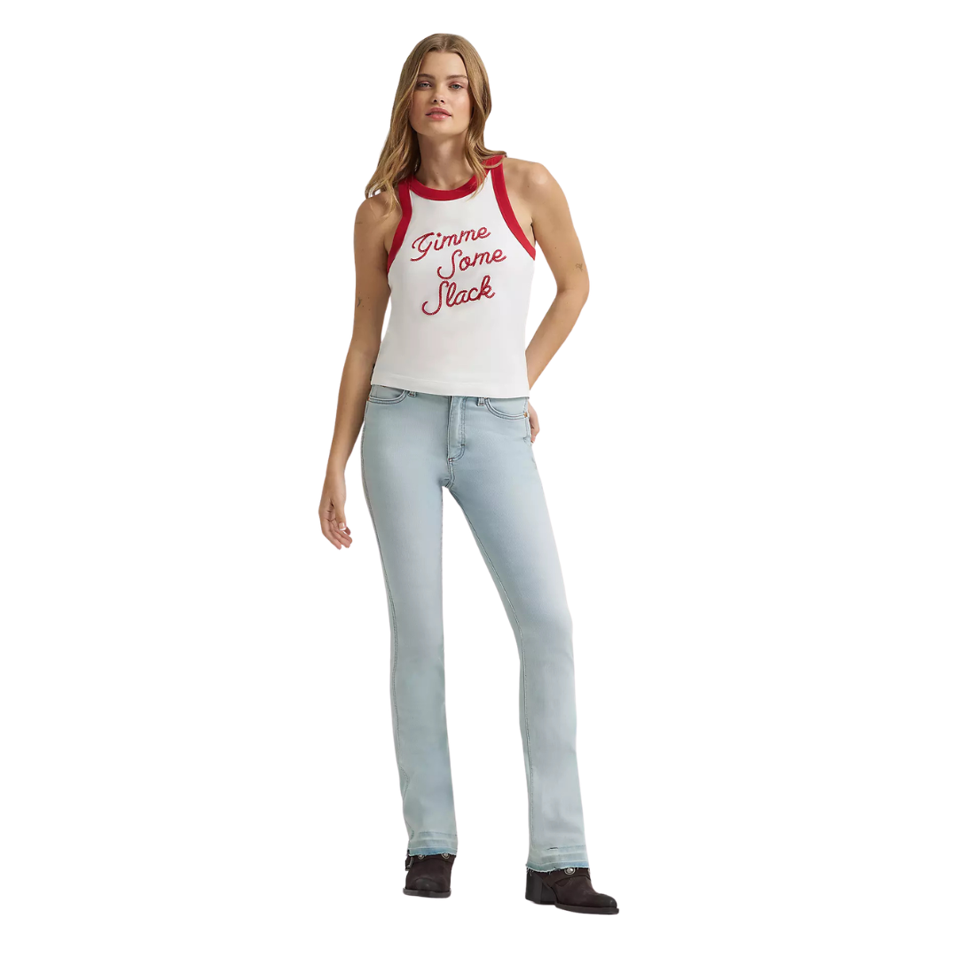 Built for movement and sun-soaked moments, the Lainey Wilson x Wrangler® Gimme Some Slack Tank is ready to roam. It’s cut with a slim, slightly cropped silhouette that’s perfect for soaking up the sun. To match the red trim along the armholes and neckline, we added a line from Lainey's hit song “Good Horses” to bring her lyrics to life. Plus, it’s crafted from cotton for nonstop comfort.